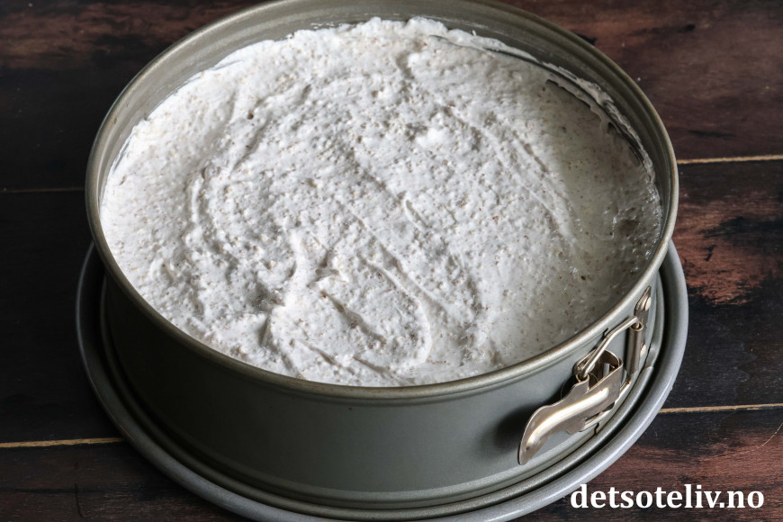 Ha mandeldeigen i en rund kakeform (24 cm i diameter) med bakepapir i bunnen.