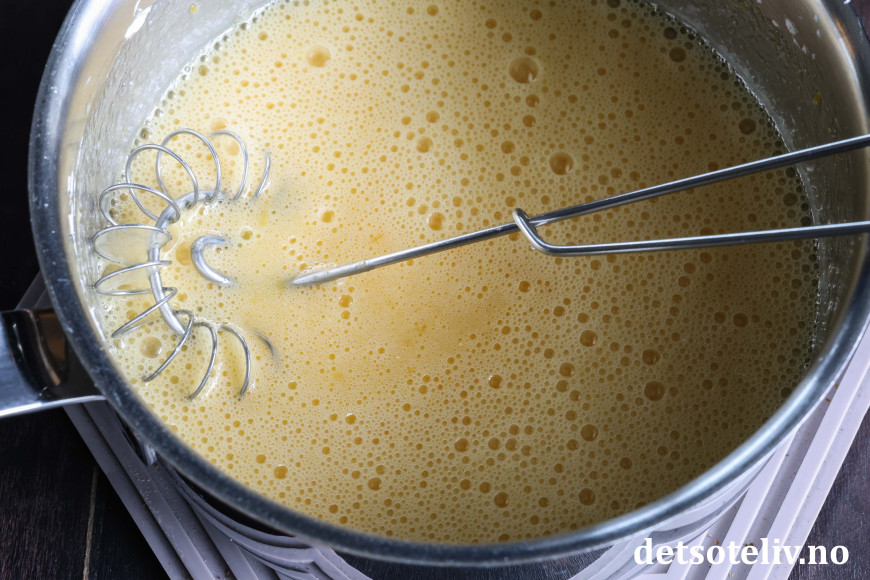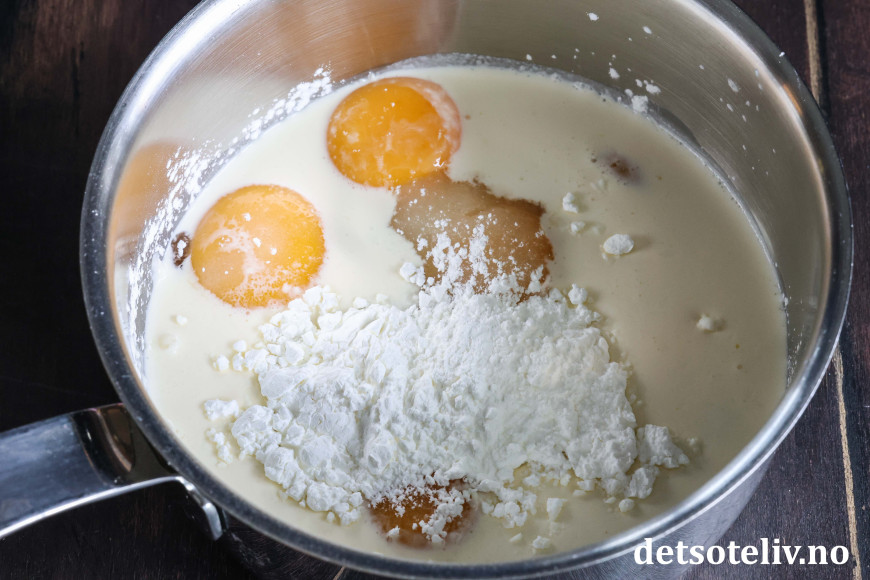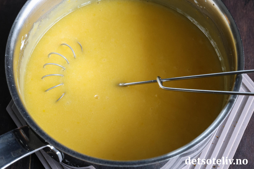 Til fyllet has eggeplommer, kremfløte, sukker og vaniljesukker i en kjele. Varm opp på middels varme under stadig visping, helt til du merker at blandingen tykner.