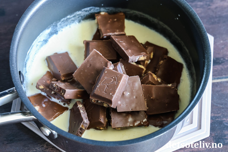 La sjokoladen smelte sammen med den varme fløten og rør glasuren jevn.