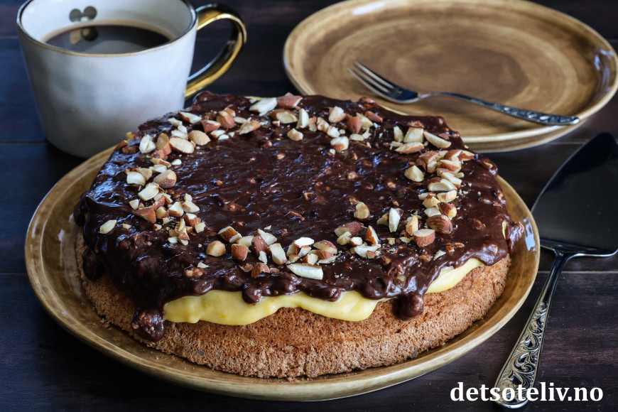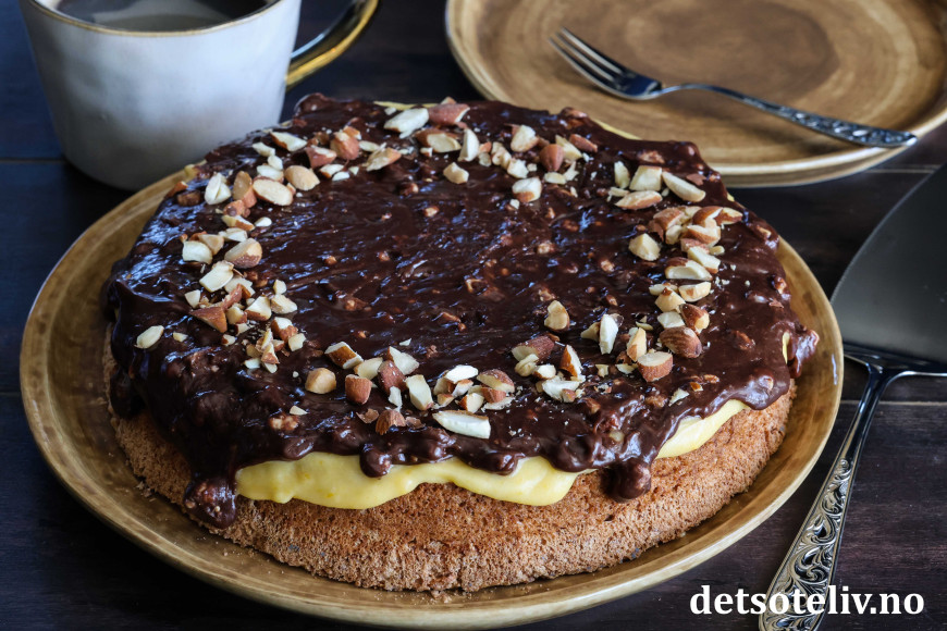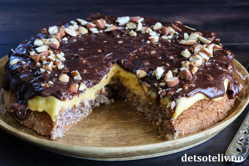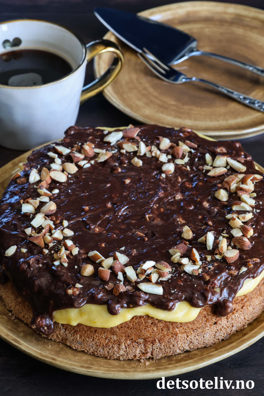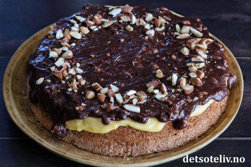 Ikke nok med at Suksesskake med mandelbunn og gul suksesskrem er digg! Her toppes kaken i tillegg med en sjokoladeglasur laget av fløte og Walters Mandler.