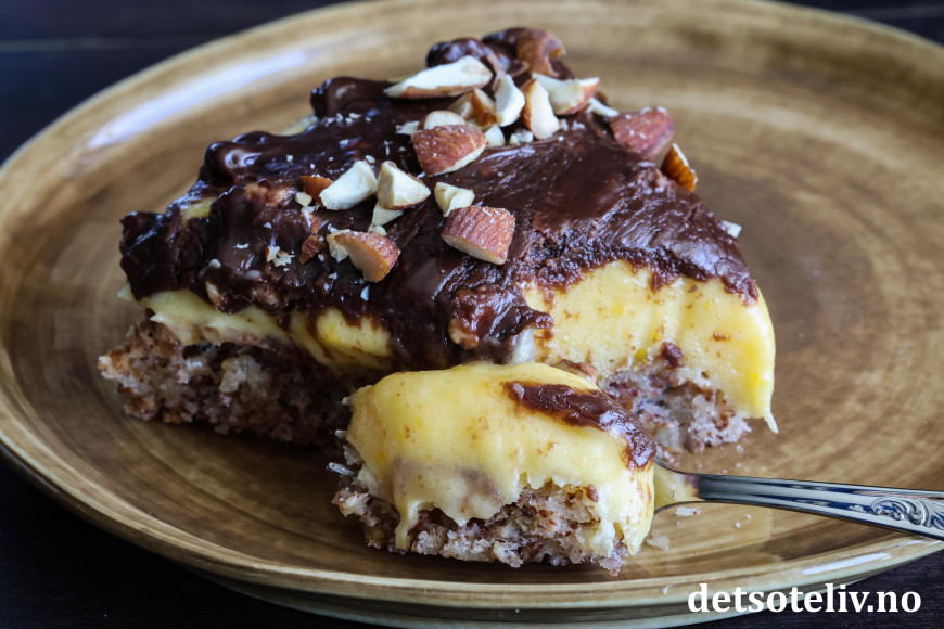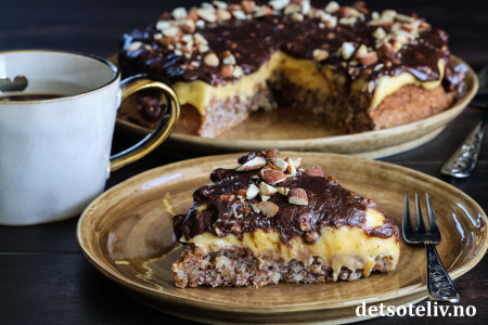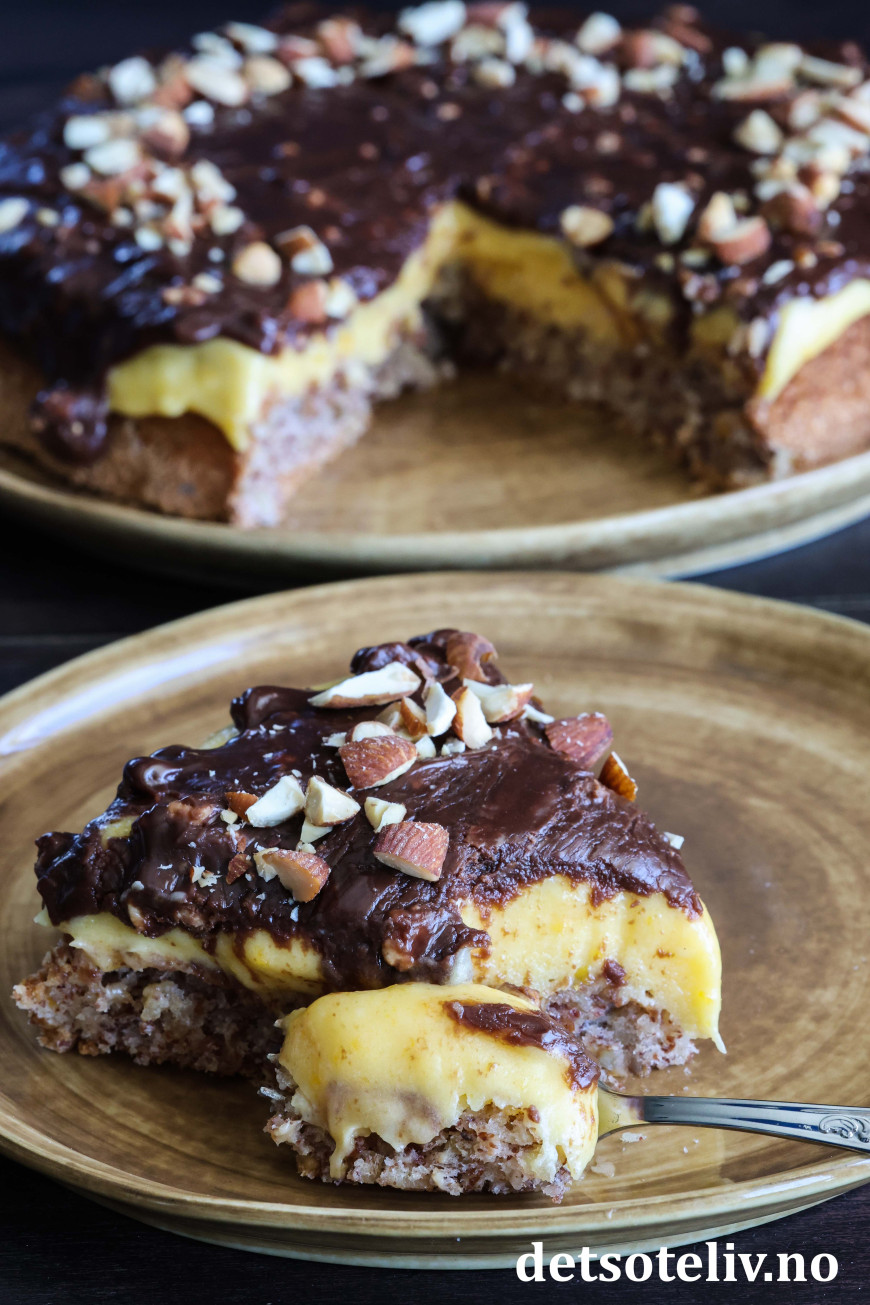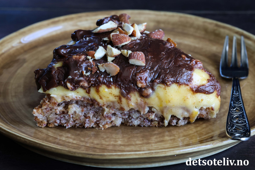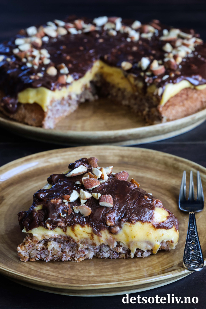 Ikke nok med at Suksesskake med mandelbunn og gul suksesskrem er digg! Her toppes kaken i tillegg med en sjokoladeglasur laget av fløte og Walters Mandler.