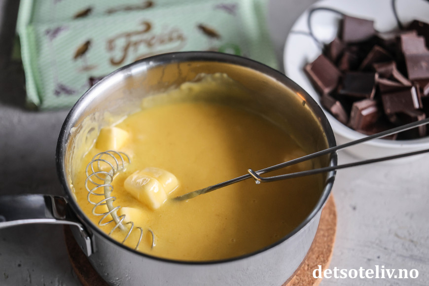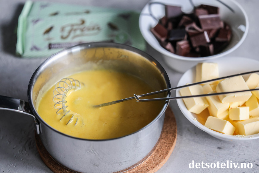 Til sjokoladekremen has eggeplommene i en kjele sammen med kremfløte og sukker. Varm opp blandingen og la den småkoke i noen minutter til den tykner.
