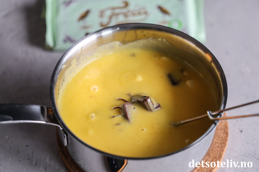 La sjokoladebitene smelte og rør kremen jevn og klumpfri.