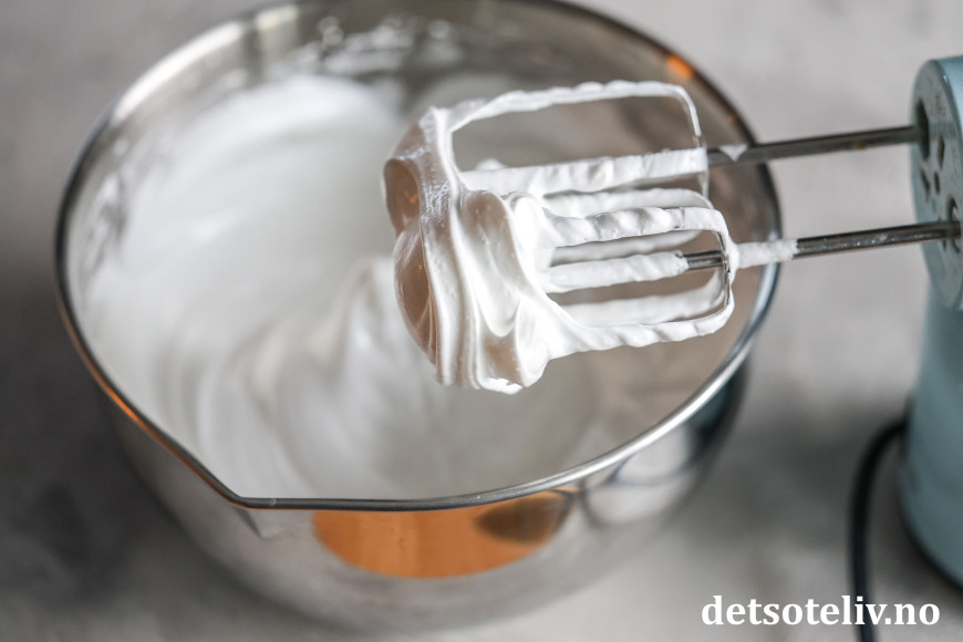 Pisk eggehvitene stive. Tilsett sukker og pisk videre til tykk marengs.