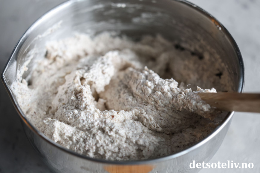 Mal mandlene fint i mandelkvern og vend inn.