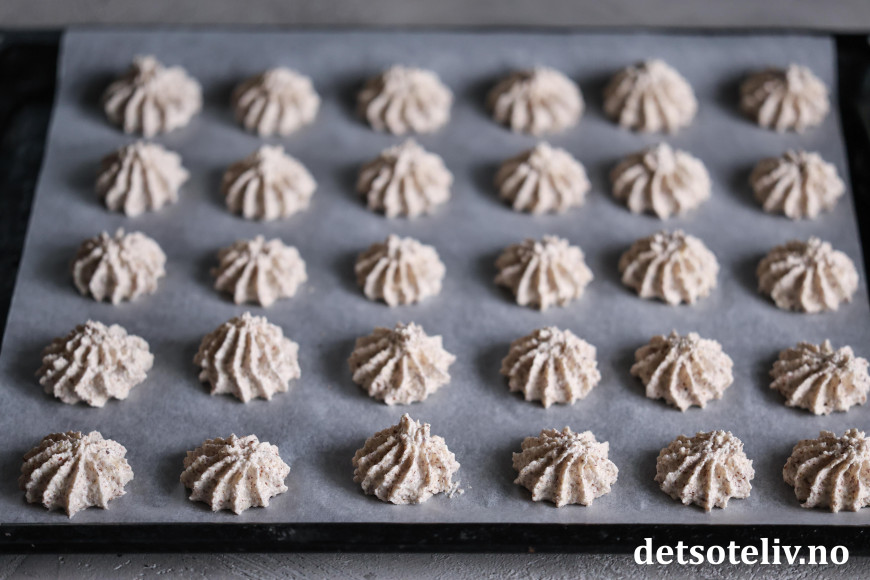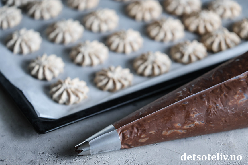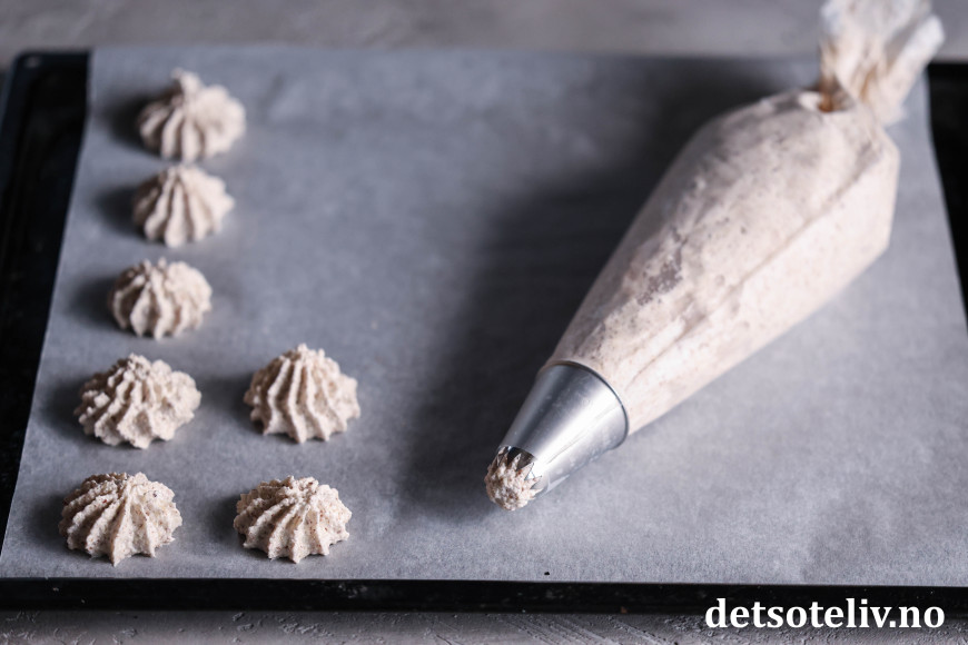Ha mandeldeigen i en sprøytepose med stor sprøytetipp. Sprøyt mandeldeigen ut på bakepapir til små topper.