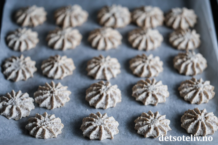Stek kakene midt i ovnen ved 180 °C i ca. 12-15 minutter. Avkjøl kakene på platen før de etter hvert flyttes over på rist og avkjøles helt.