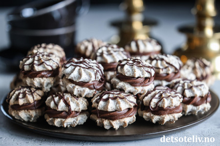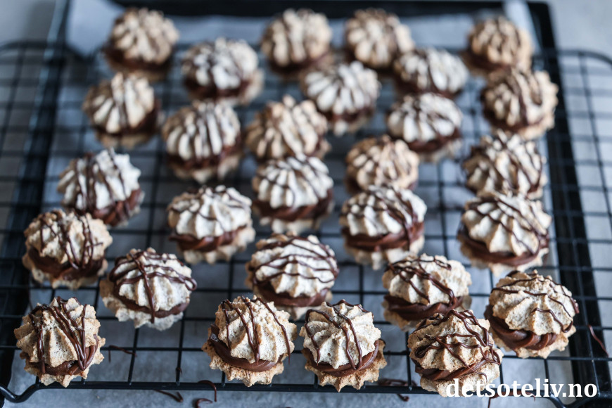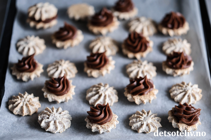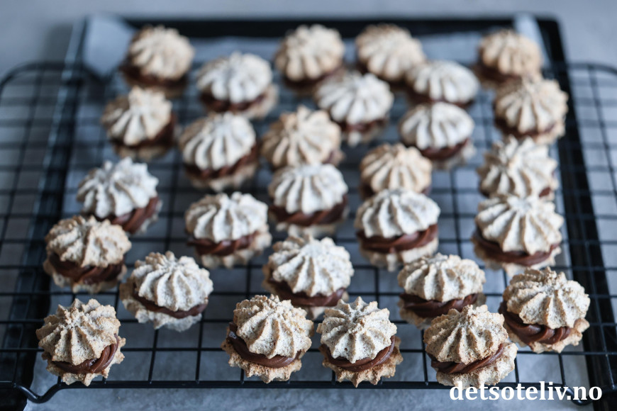 Når sjokoladekremen er tykk, has den i en sprøytepose med mellomstor sprøytetipp. Sett sammen to og to mandelkaker med sjokoladekrem imellom.
