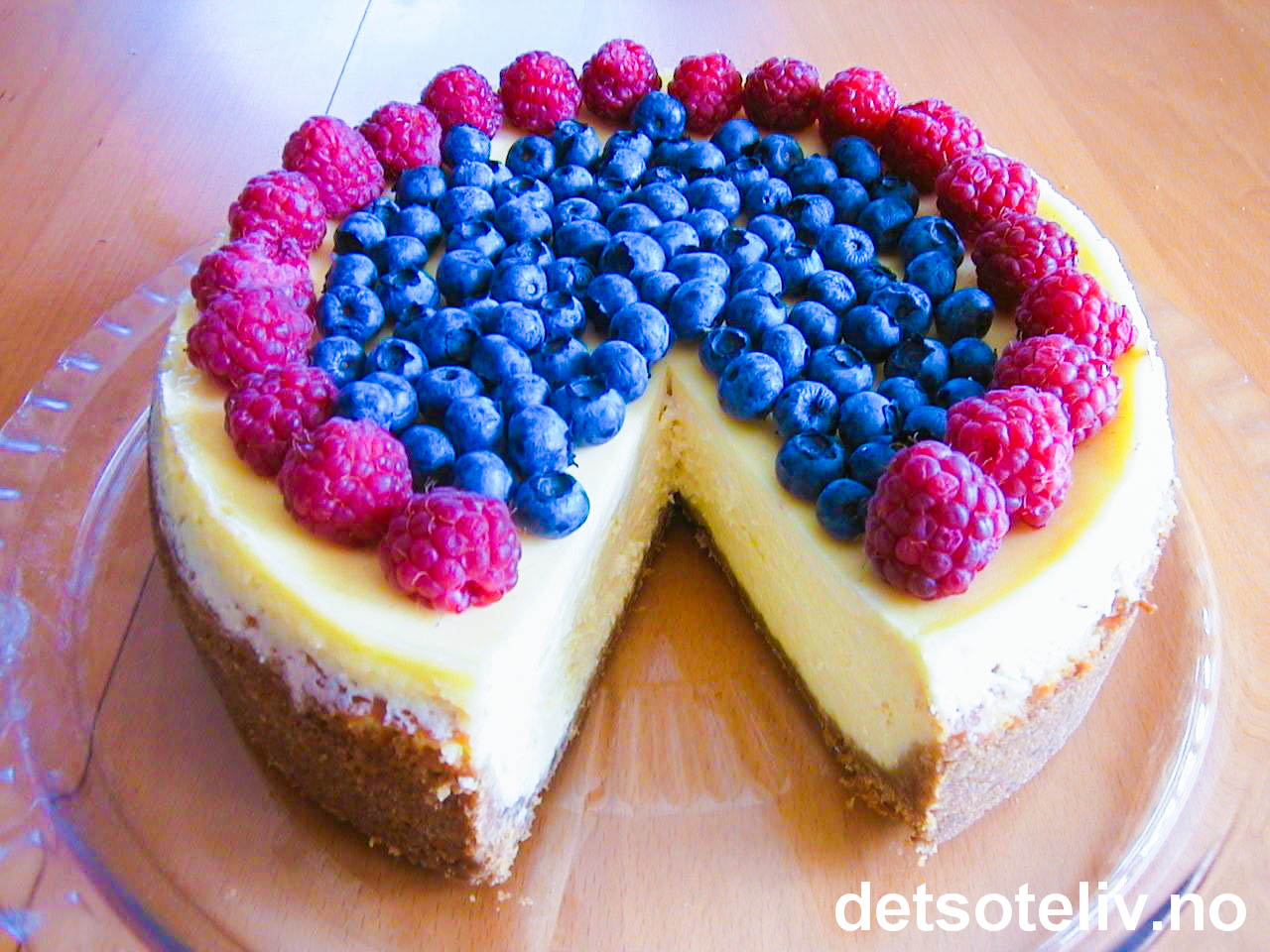 Vær oppmerksom på at kaken ofte hever seg i ovnen (som en sufflé). Den vil imidlertid synke ned igjen under avkjøling. Sannsynligvis kommer ostekaken til å sprekke litt opp på overflaten under avkjøling. Dette gjør ikke noe, siden den skal dekkes med crème fraîche-toppingen og bær.