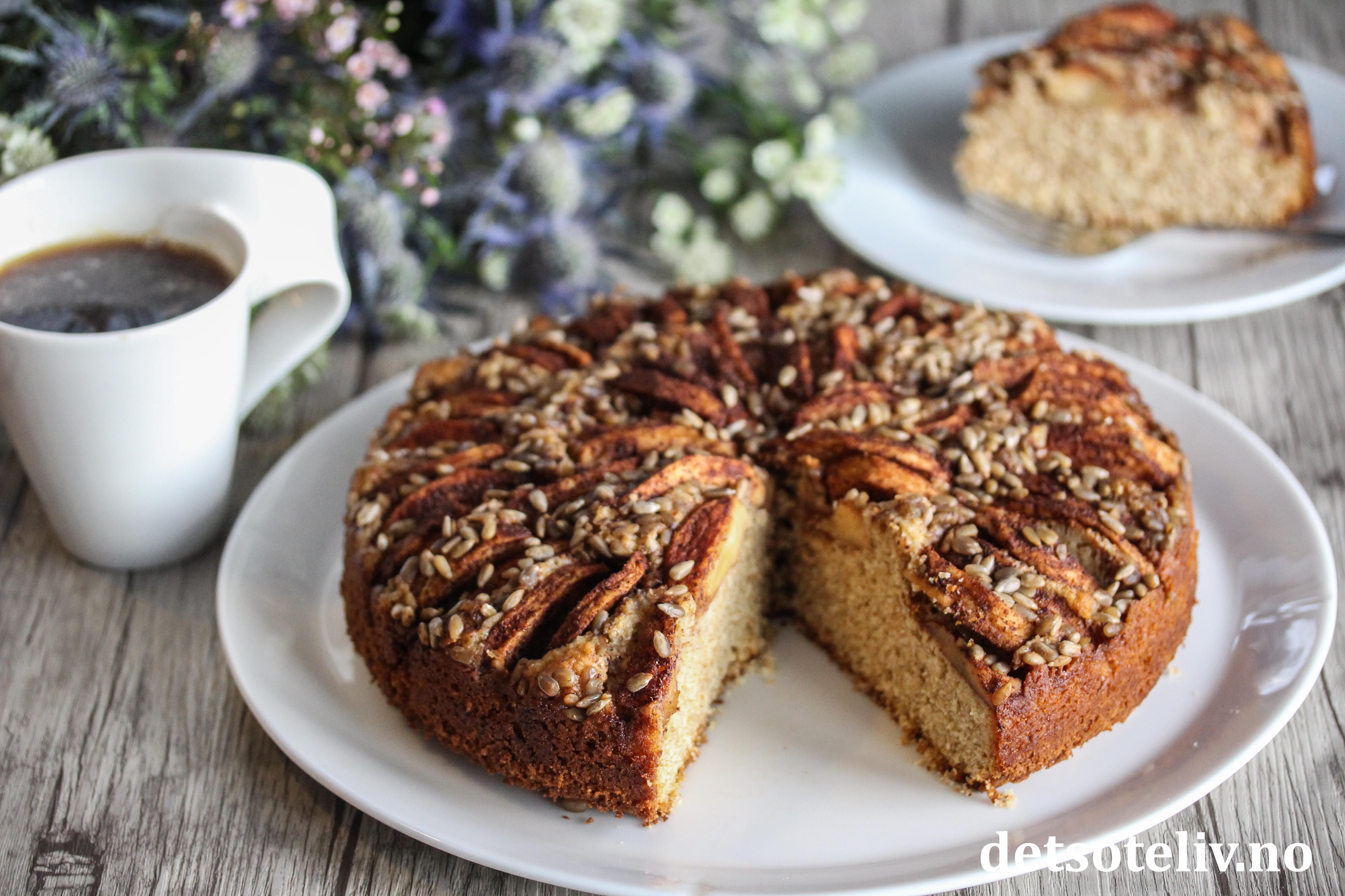 Her har du både grovt sammalt mel, fint sammalt mel, havregryn og solsikkekjerner. Og masse epler, selvfølgelig. En skive av denne kaken gir meg assosiasjoner til en god og myk grovbrødskive med ekstra deilig smak. 😋