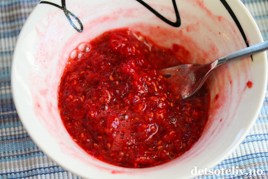 Rør sammen bringebær og sukrinmelis og ha en spiseskje rørte bringebær på toppen av ostefyllet.
