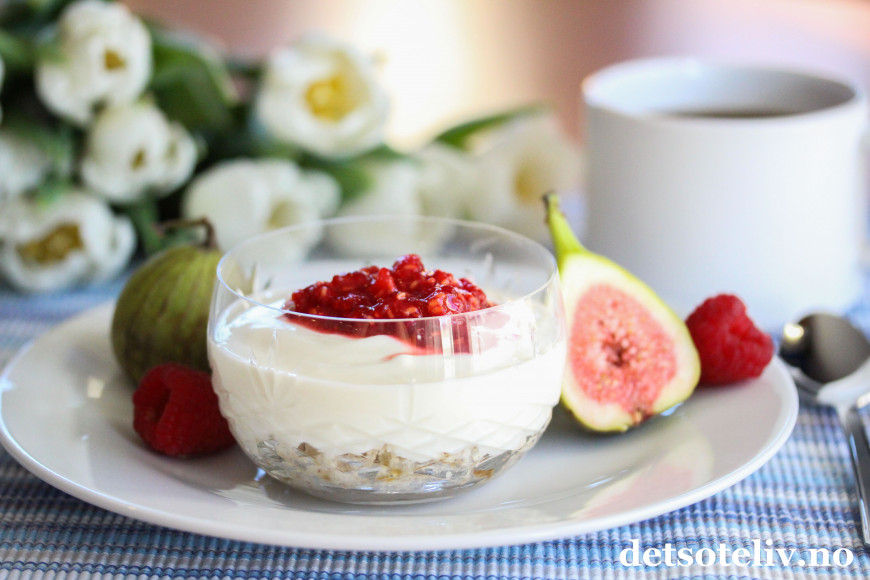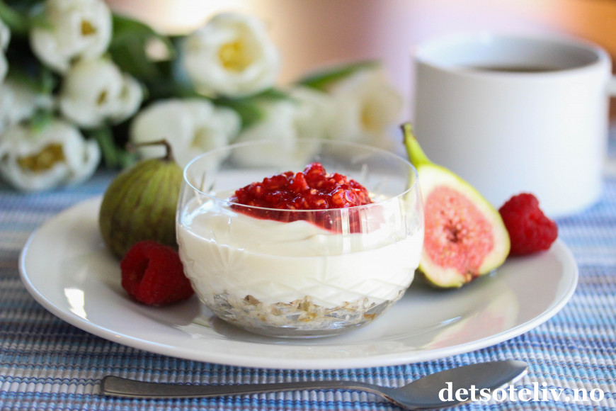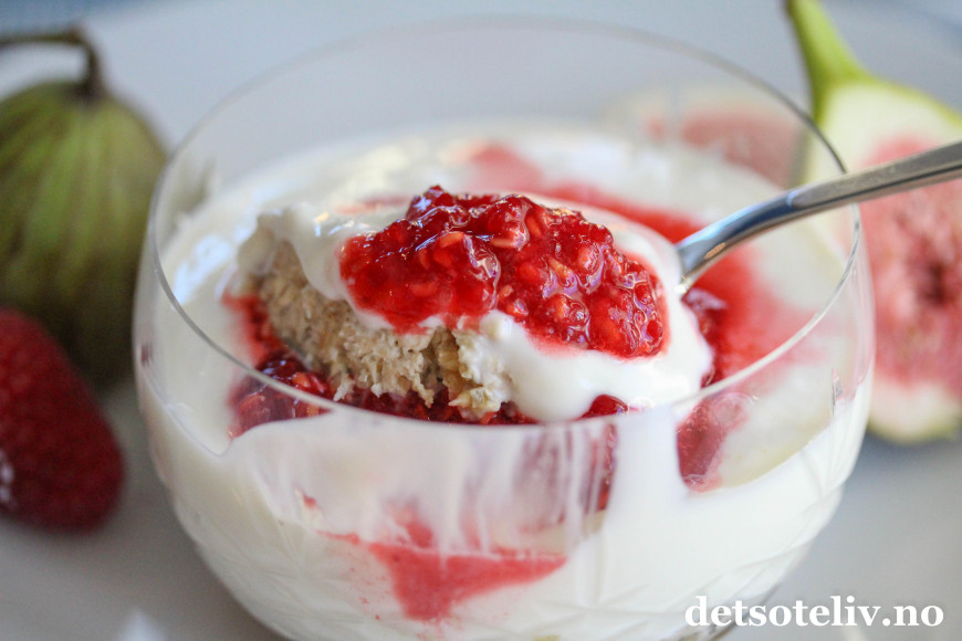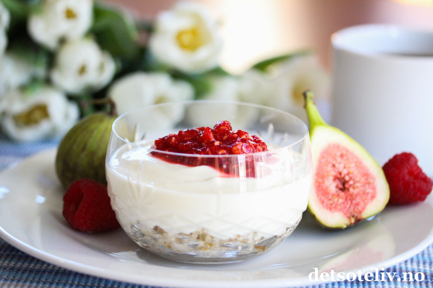 Denne delikate, deilige ostekaken lages raskt når du får lyst på noe godt i hverdagen. Bunnen er laget med havre og lyse rosiner, og selve ostekremen består av gresk yoghurt, vanilje og Apetina Kremost Lett Naturell som bare inneholder 4 % fett. Søter du med sukrinmelis, blir desserten søt selv om den er sukkerfri og dessuten kalorifattig (en porsjon inneholder kun 126 kcal). Server med moste bringebær.