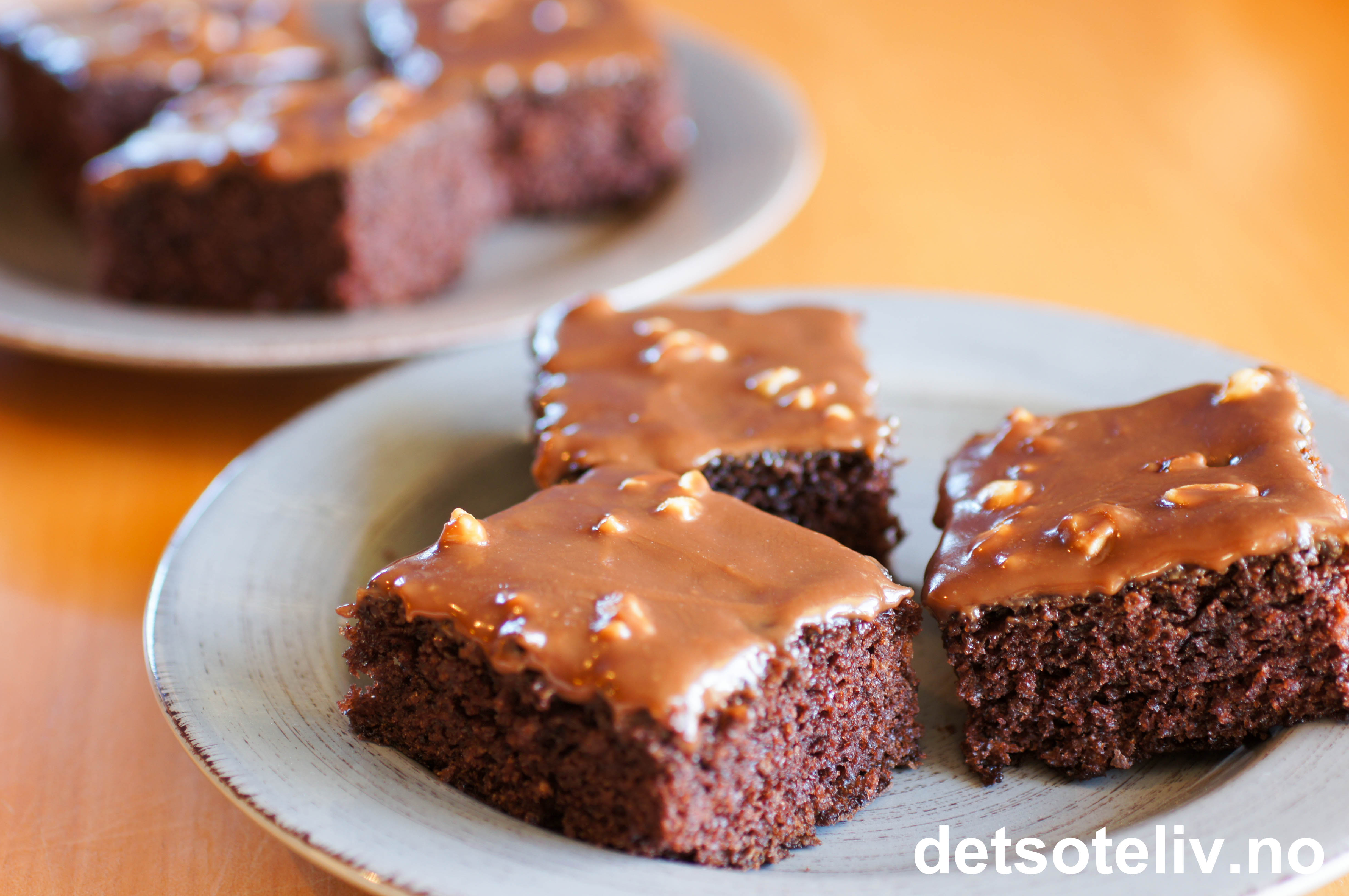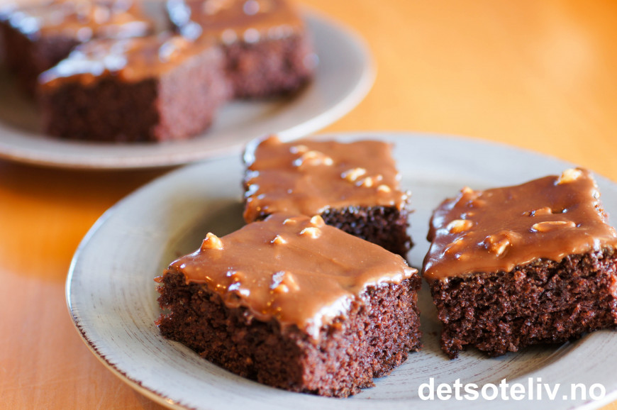 Til glasuren has alle ingrediensene i en kjele. Varm opp under omrøring til alt har smeltet og glasuren er glatt og klumpfri. Avkjøl glasuren til den har passe smørekonsistens før den bres over kaken med en smørekniv. Del kaken opp i passe store firkanter.