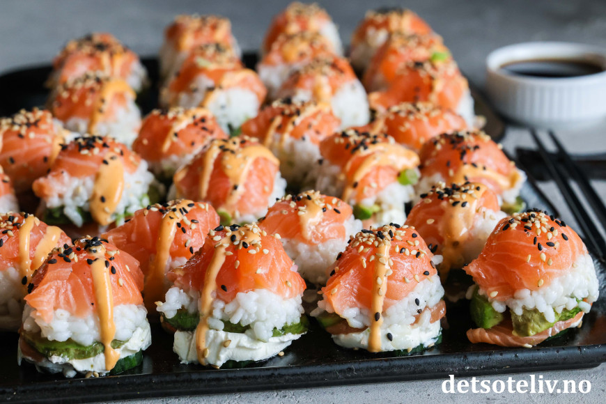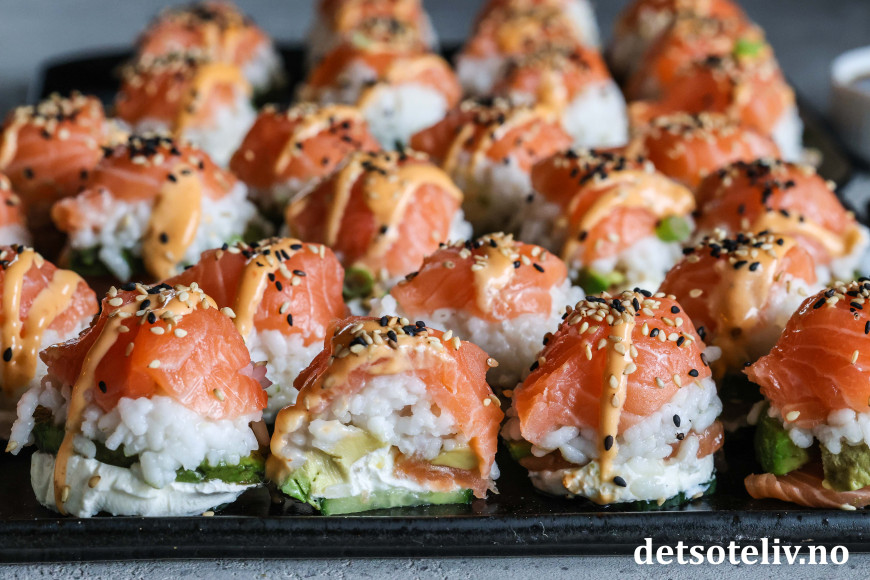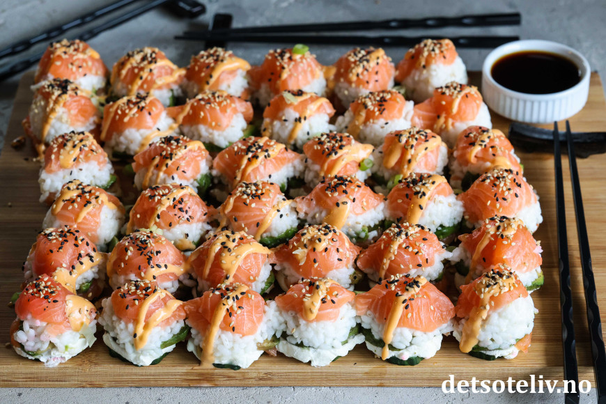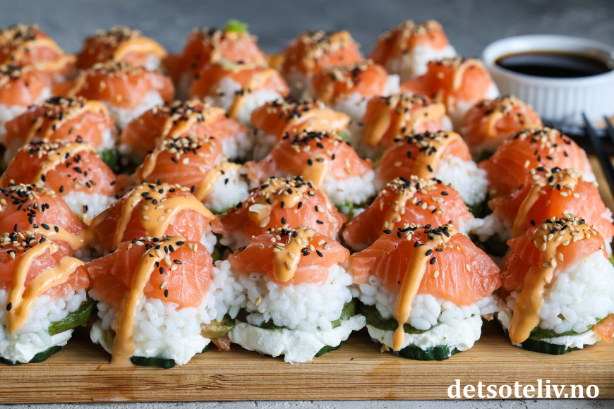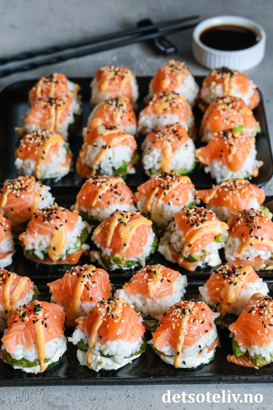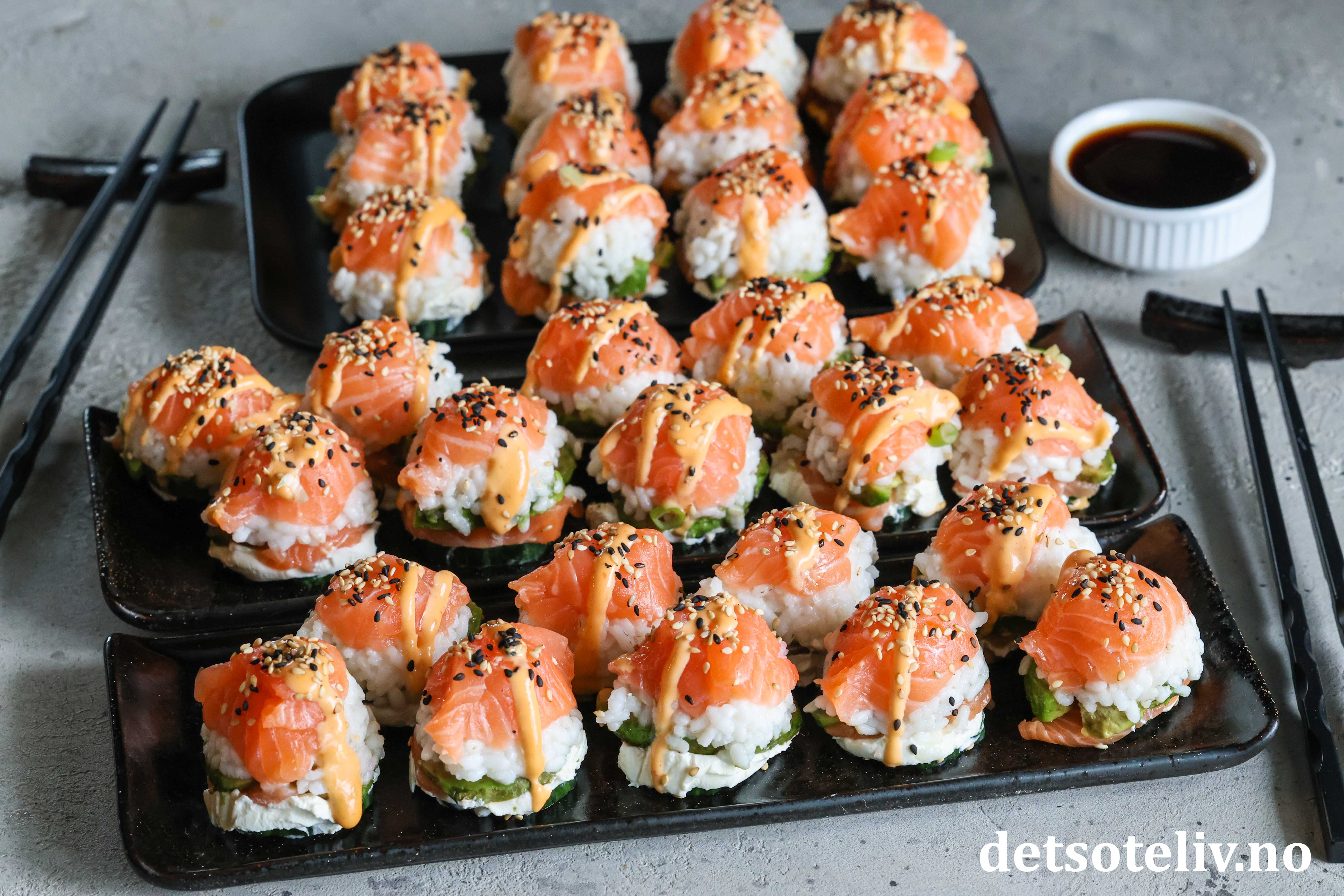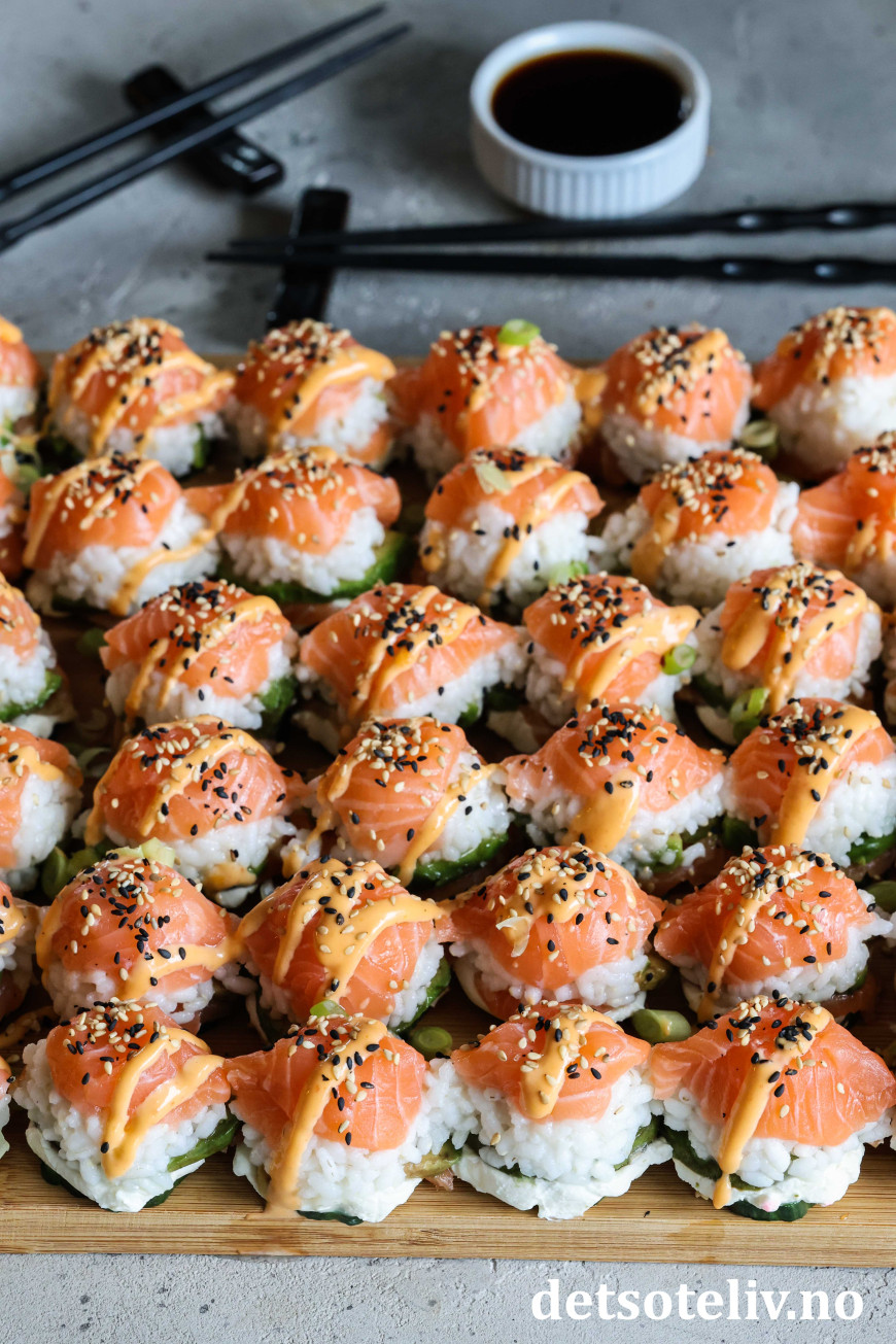 Se også Baked Salmon Sushi Cups (Sushimuffins), Crispy Rice Sushi Bites (Stekte sushibiter) og Sushivafler (Salmon Crispy Rice Waffles).