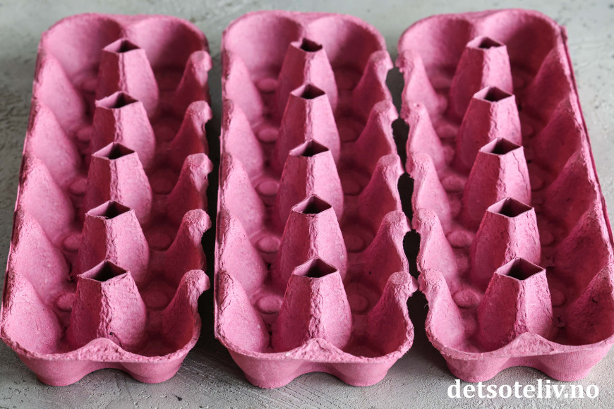 Finn frem 3 eggekartogner (à 12 egg) og klipp dem til slik at de blir lette å snu opp ned (jeg klipper til kantene og spissene som stikker opp i midten).