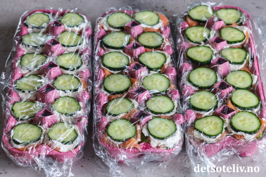 ♥ Hvis du vil, kan du legge biter av noriark i midten av sushibitene. Det går også an å bytte ut agurkskivene med noriark, men da vil ikke sushibitene få like robust underlag.