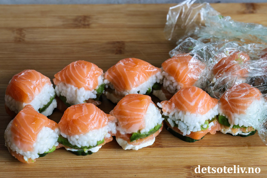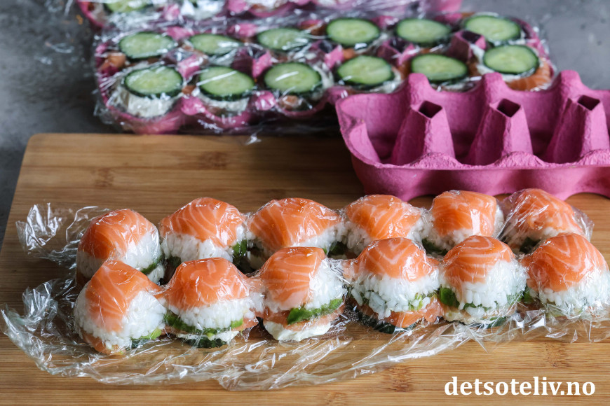 Skjær laksefilet i tynne skiver og legg skivene i bunnen av hver fordypning i eggekartongene. Legg på en god spiseskje sushiris og press risen forsiktig sammen med en teskje. Dekk med avokadoskive og så en ny skive laksefilet. Legg på en stor teskje kremost. Skjær agurken i skiver. Legg en skive på hver kremostdott og trykk agurkskiven lett nedover slik at kremosten fordeler seg jevnt og agurkskiven fester seg til kremosten. Gjenta med resten av agurkskivene.