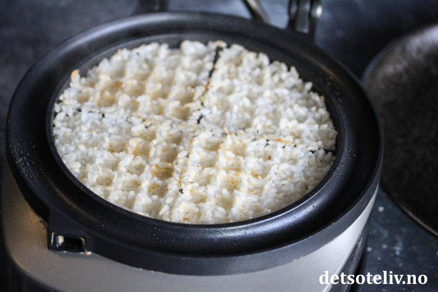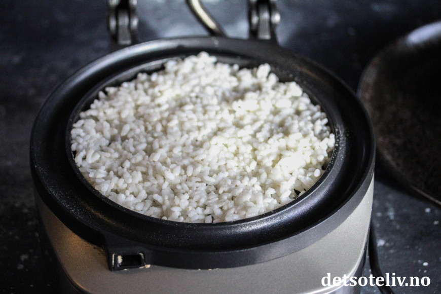 Tilsett 4 dl vann og varm opp til kokepunktet. Legg på lokk og senk varmen. La risen småkoke i ca. 10 minutter. Ta kjelen av platen og la risen bli i kjelen med lokket på til den er romtemperert.