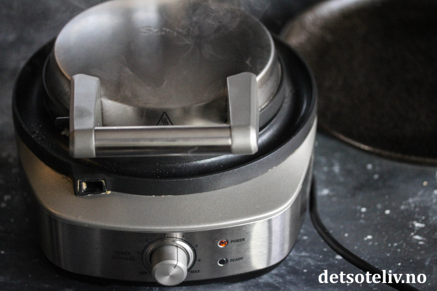 Stek vaffelen på middels varme til den er gyllen i kantene og på overflaten. Dette tar nokså lang tid, ca. 10 - 15 minutter.