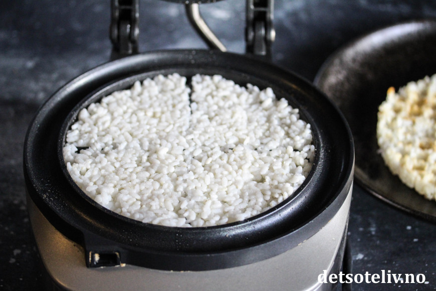 Ha ris i vaffeljernet og press det utover med baksiden av en spiseskje. Fyll opp med ris slik at hele vaffeljernet blir dekket. For at vaffelen skal henge godt sammen når den er stekt, må det ikke være huller i laget med ris, og laget med ris bør heller ikke være for tynt.