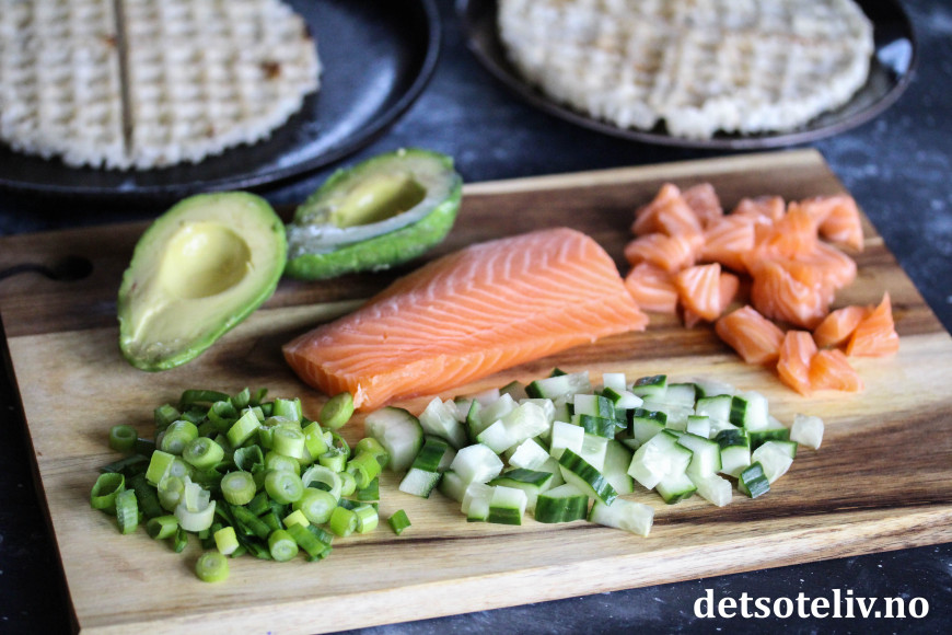 Rett før servering toppes risvaflene med laks, avokado, agurk og vårløk.