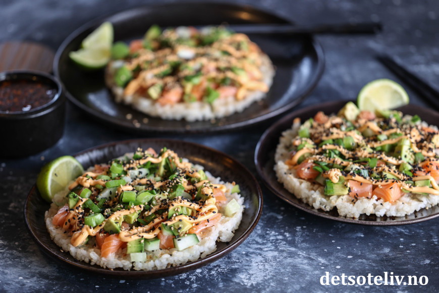 Konseptet går ut på å steke Sushiris i vaffeljern til du får en vaffel som er sprø på utsiden og myk inni. Jeg toppet vaflene her med terninger av salmalaks, avokado, agurk og vårløk, og pyntet med sesamfrø og chilimajones. Ponzusaus er herlig tilbehør.