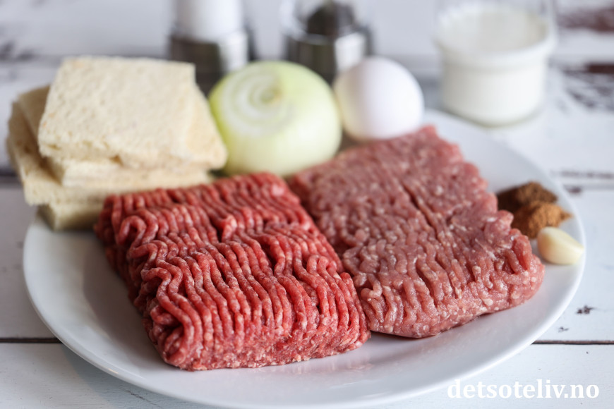 ♥ Siden kjøttdeig av storfe og svinekjøttdeig selges i pakninger à 400 gram, syntes jeg det var mest praktisk å bruke 400 av hver. Det blir kraftigere kjøttsmak på kjøttbollene hvis du bruker 500 g kjøttdeig av storfe og bare 250 g svinekjøttdeig.