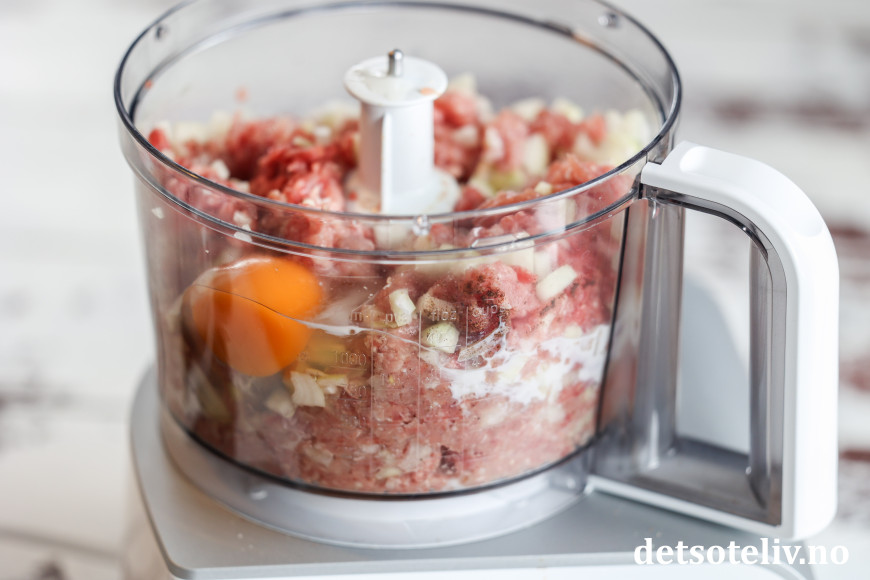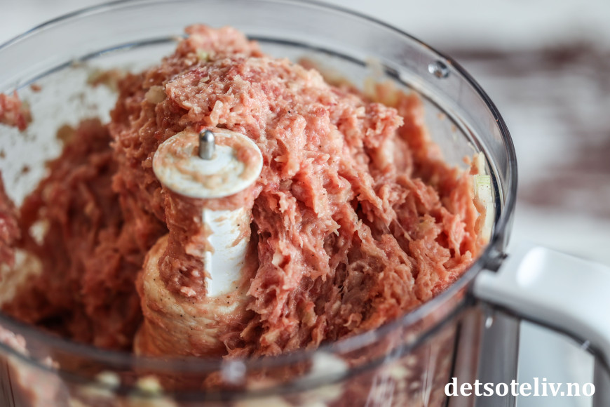 Ha begge typer kjøttdeig, fint hakket løk og hvitløk og krydder i en food processor.