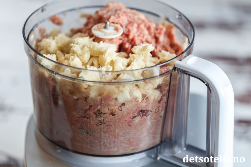 Ha begge typer kjøttdeig, fint hakket løk og hvitløk og krydder i en food processor. Tilsett egget og melk. Kjør blandingen sammen til en jevn masse. Tilsett små biter av loff. Kjør dette sammen til alt har blandet seg godt sammen.