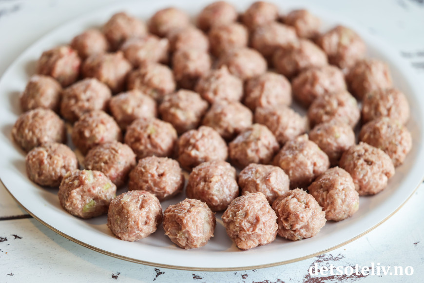 Form små kjøttboller. Bruk ca. 1 stor teskje kjøttmasse til hver bolle og rull dem jevne med hendene. Skyll hendene ofte i kaldt vann. Det blir til sammen 50 - 55 små kjøttboller.