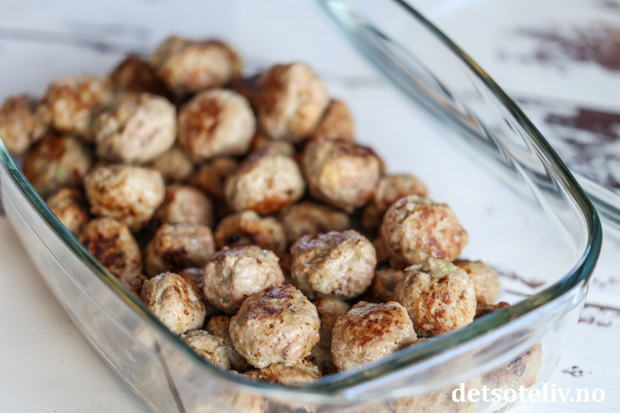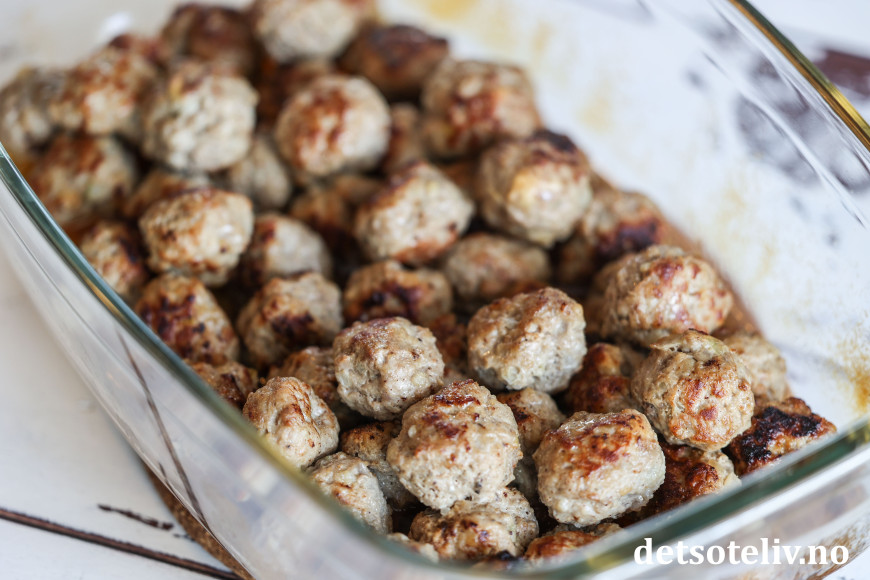 Stek kjøttbollene midt i ovnen ved 180°C i ca. 30 minutter.