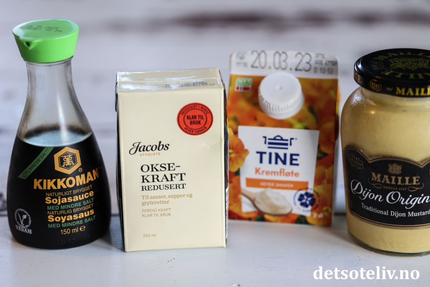 Tilsett deretter kremfløte, soyasaus og sennep.