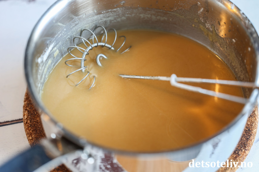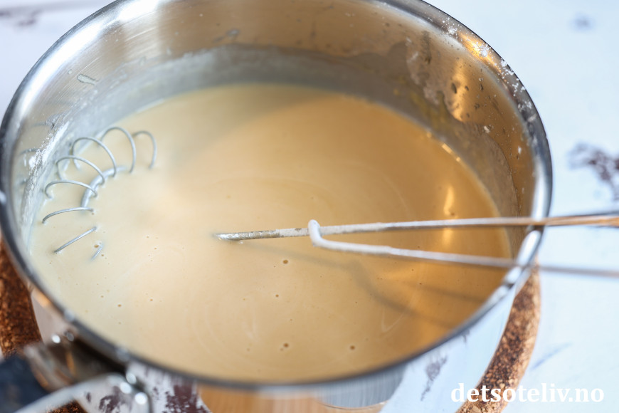 Smelt smøret i en kjele. Tilsett melet og visp blandingen sammen til en jevning.