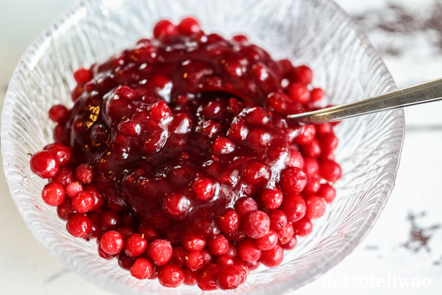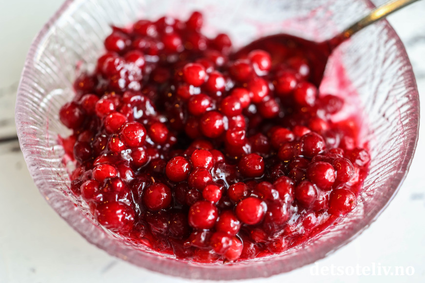 ♥ Bruk gjerne hjemmelaget tyttebærsyltetøy (oppskrift HER). Ekstra god blir den dersom du rører noen frosne tyttebær inn i den før servering.