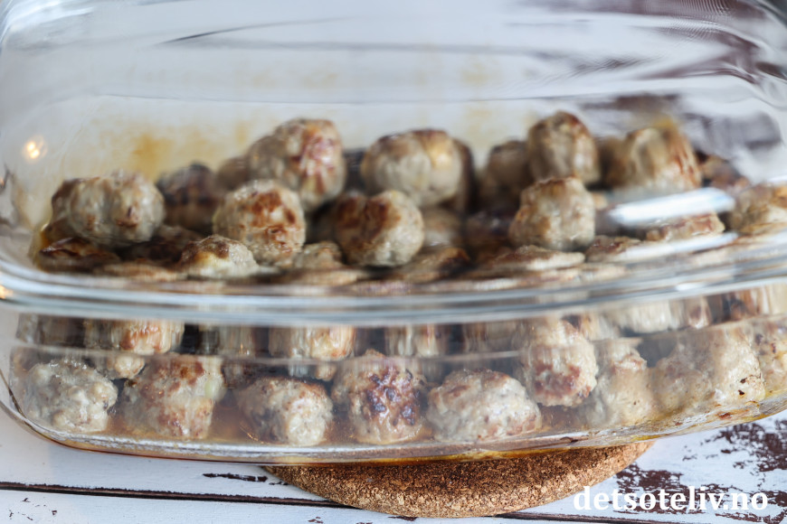 ♥ Jeg bruner kjøttbollene i stekepanne først, og har dem deretter i stekeovnen slik at de skal bli helt gjennomstekte. Det er lurt med ildfast form med lokk slik at kjøttbollene ikke blir tørre. Dersom du ikke har ildfast form med lokk, kan du dekke til formen med aluminiumsfolie.