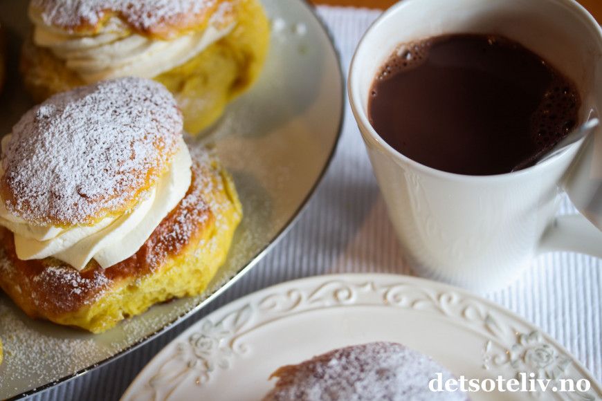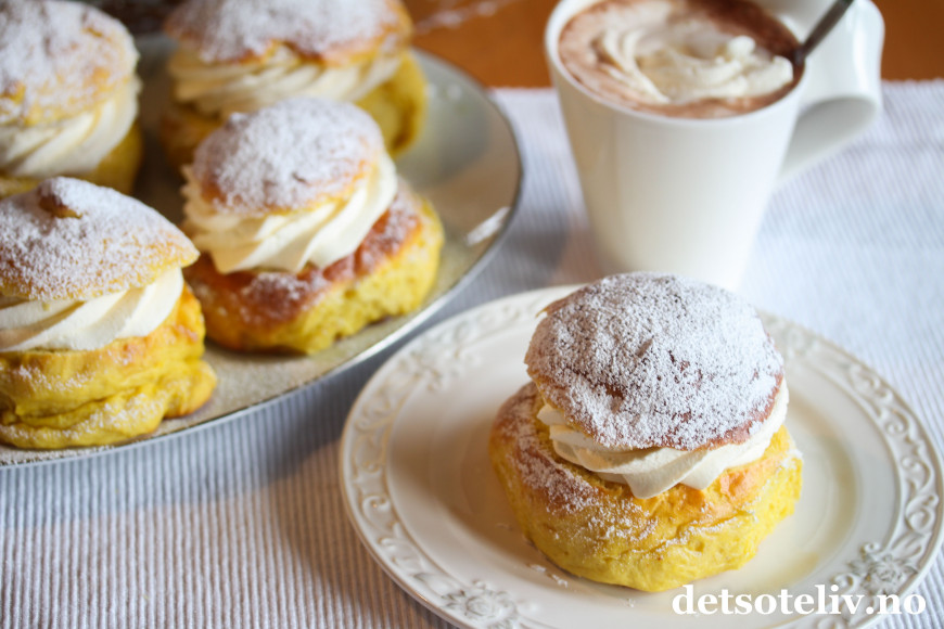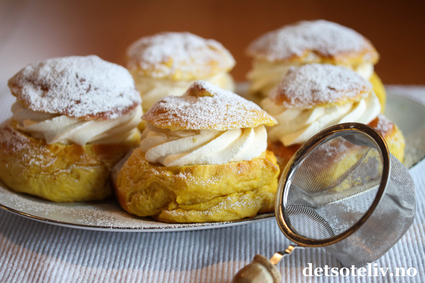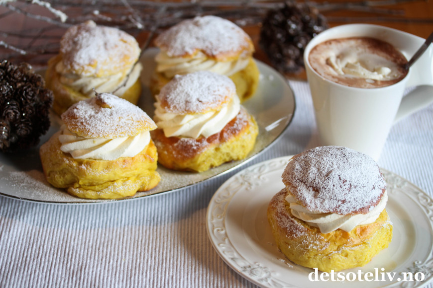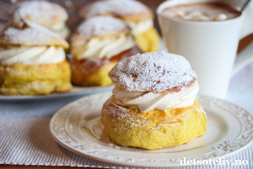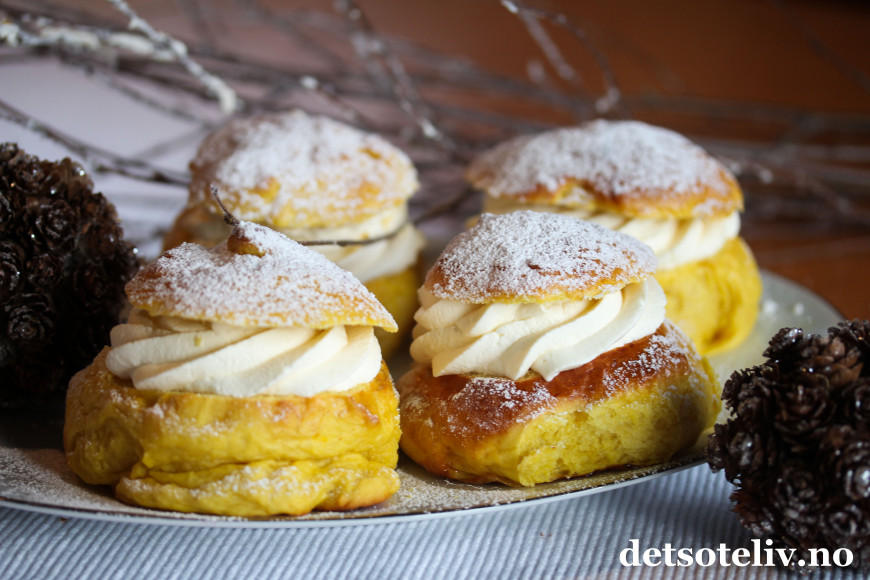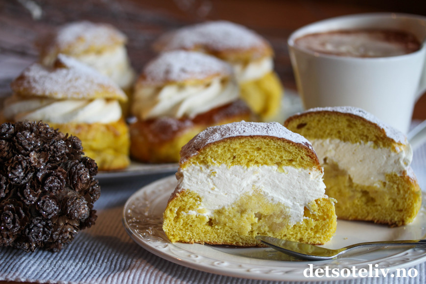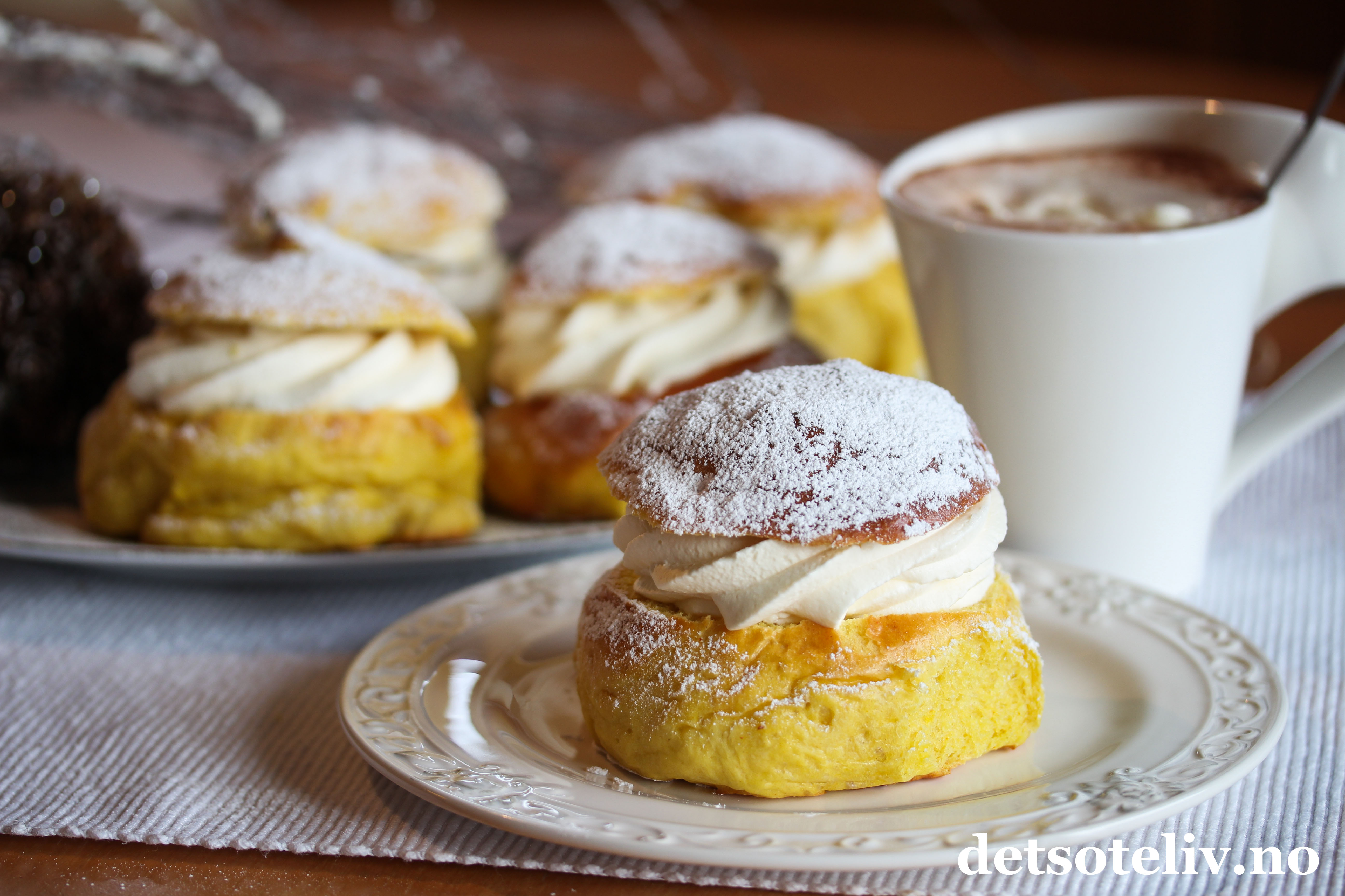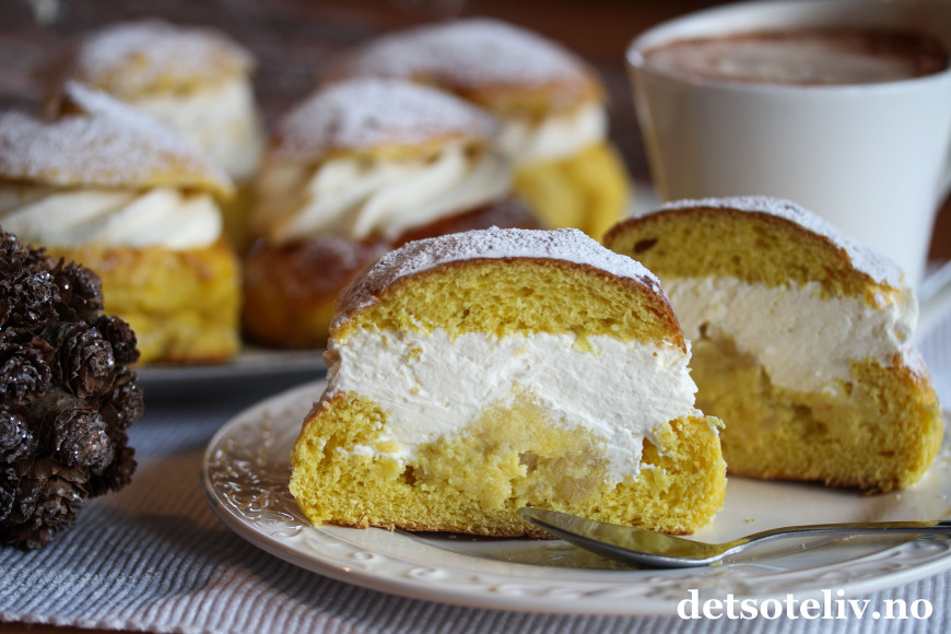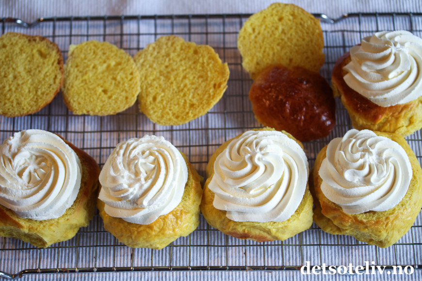 Vi snakker om store, myke hveteboller med safran som fylles med mykt mandelfyll og pisket krem. Gjærdeigen inneholder seterrømme som gjør bollene ekstra saftige og gode.