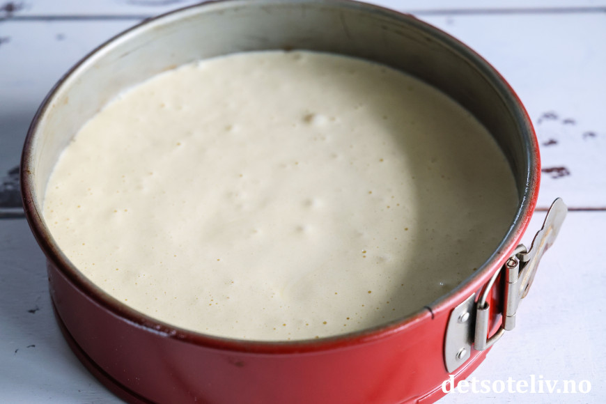 Ha deigen i en rund form (22 cm i diameter) med bakepapir i bunnen.