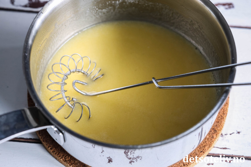Varm opp blandingen til den når kokepunktet og la småkoke i ca. 1 minutt. Ta kjelen av platen.