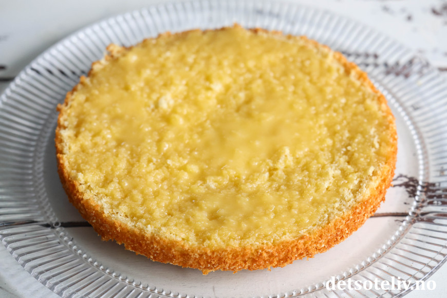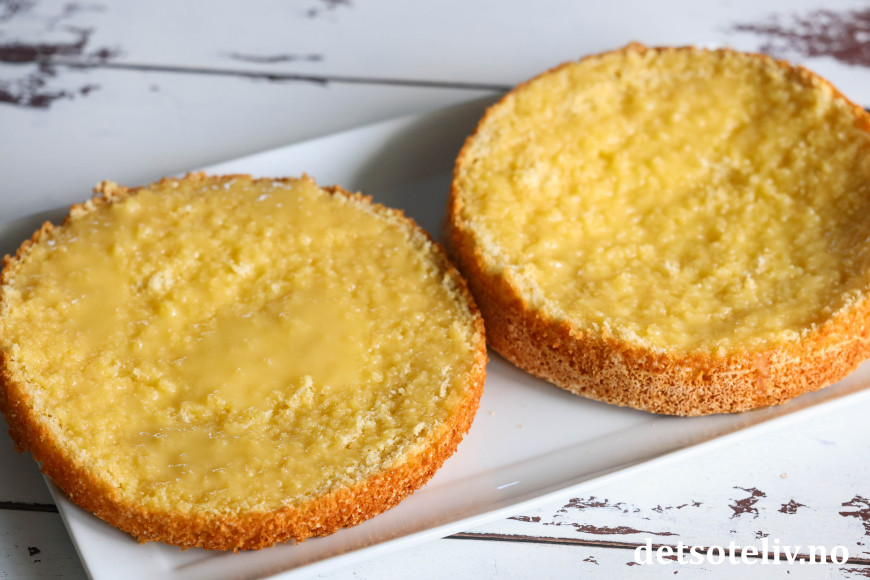 Dynk innsiden av begge kakebunnene med den varme, flytende smørblandingen. Pass på at hele overflaten på begge kakebunnene blir dynket jevnt over.