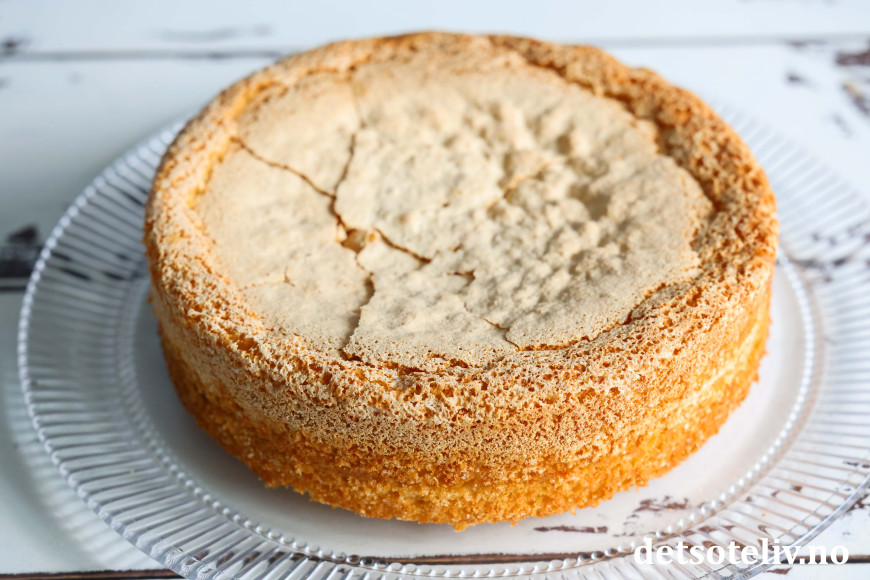 Del kaken på midten slik at du får 2 bunner. Legg bunnene på et fat med snittsiden vendende opp.
