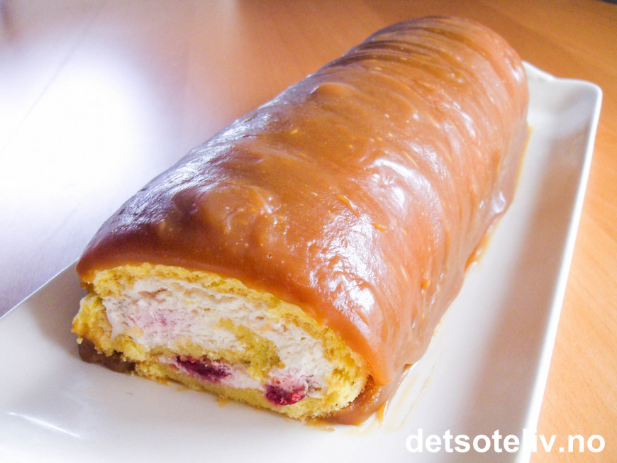 Kaken bør avkjøles under varm langpanne for at den skal holde seg myk. Ellers vil den sprekke opp når du ruller den sammen. Dersom det er vanskelig å dra av bakepapiret, hjelper det å pensle oppå bakepapiret med kaldt vann.