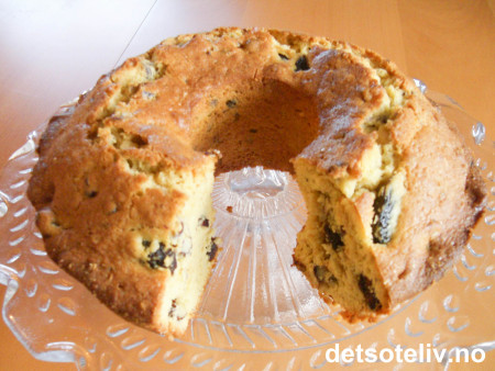 Ha deigen i en godt smurt og strødd kakeform som rommer 1,5 liter. Jevn til overflaten. Stek kaken på rist på nederste rille i ovnen ved 175°C i ca 45 min. Avkjøl kaken litt i formen før den hvelves ut og avkjøles helt.