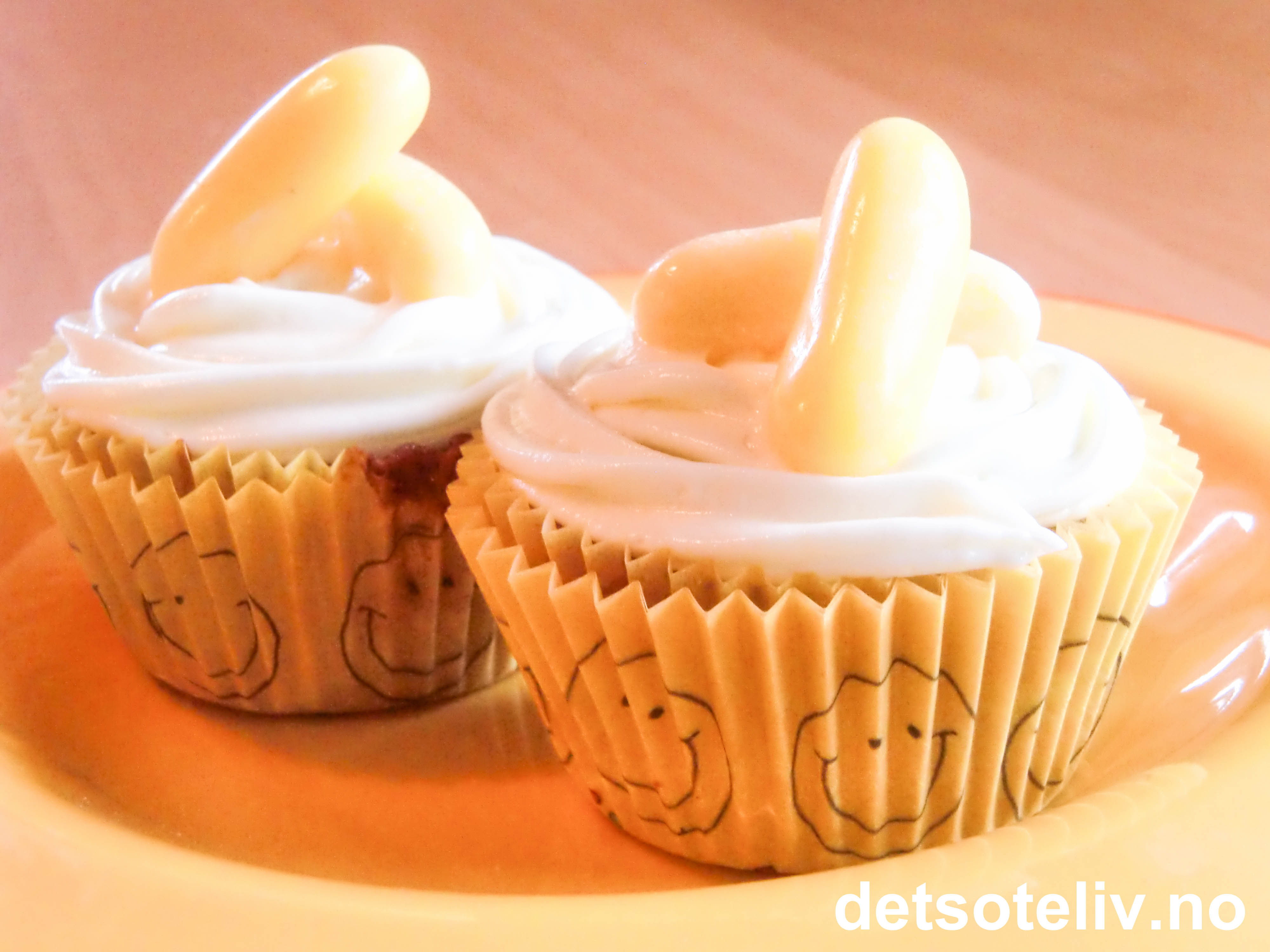 Pisk sammen ingrediensene til ostekremen så den blir luftig. Smør eller sprøyt ostekrem på hver muffins og pynt med gule banangodteri.
