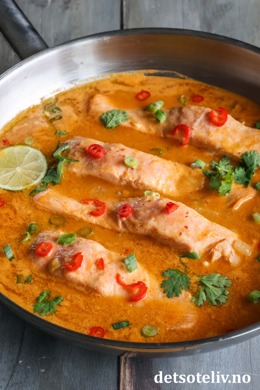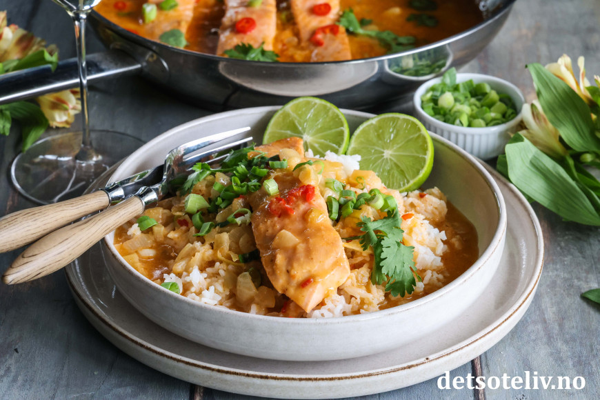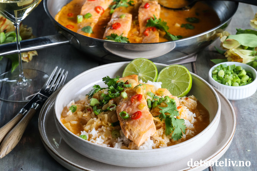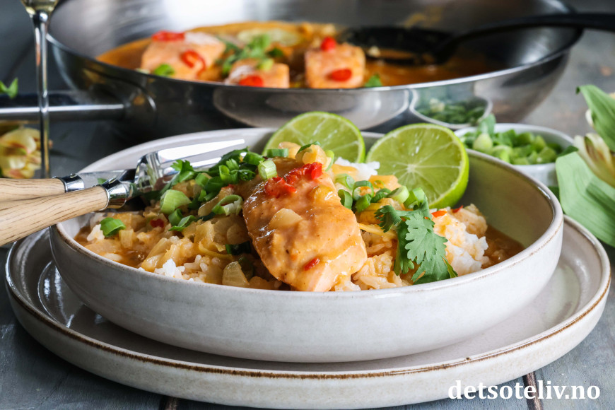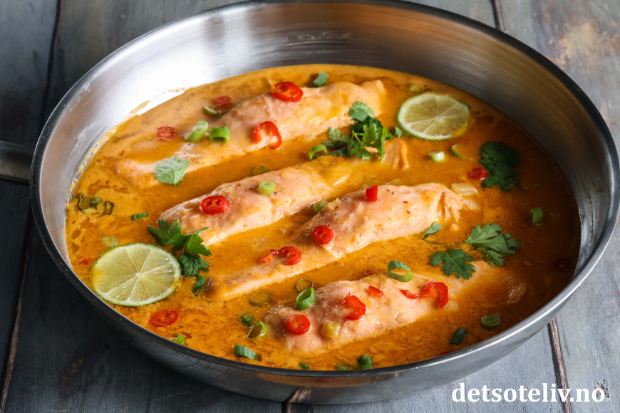 Laksefileter varmes noen minutter i en nydelig saus laget på løk, hvitløk, fersk ingefær, kokosmelk, red curry paste og sweet chilisaus.
