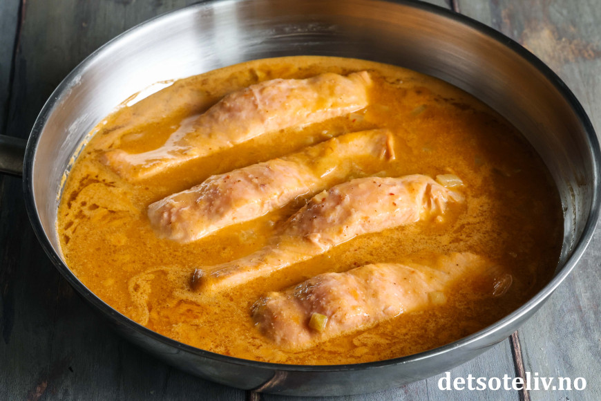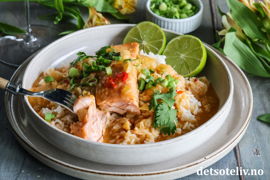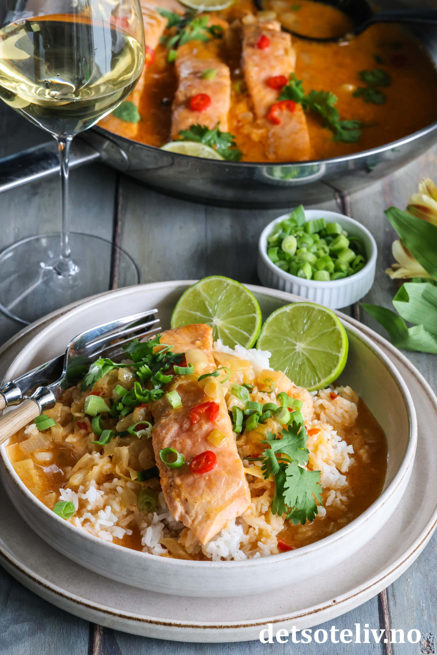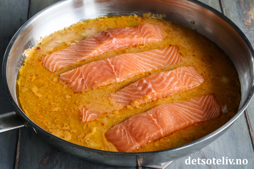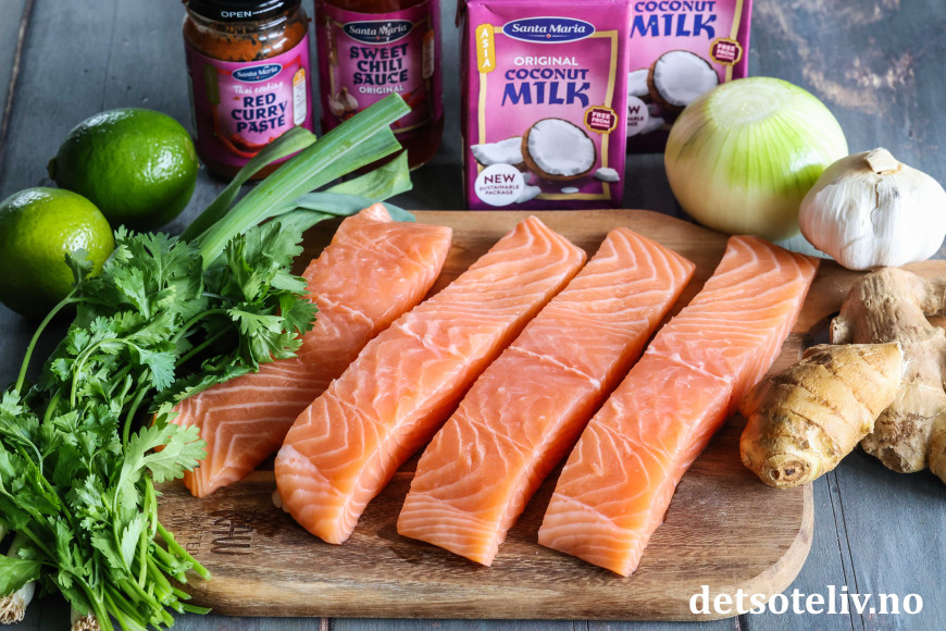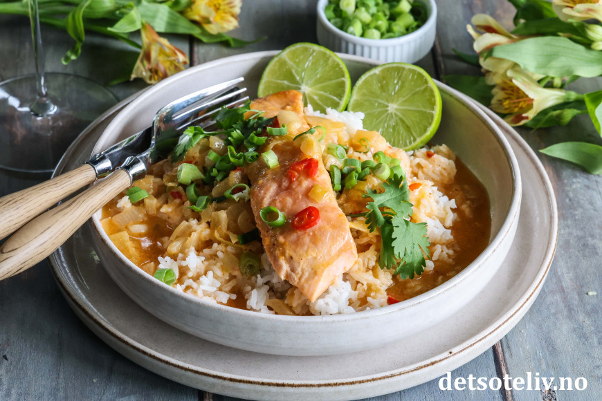 Laksefileter varmes noen minutter i en nydelig saus laget på løk, hvitløk, fersk ingefær, kokosmelk, red curry paste og sweet chilisaus.