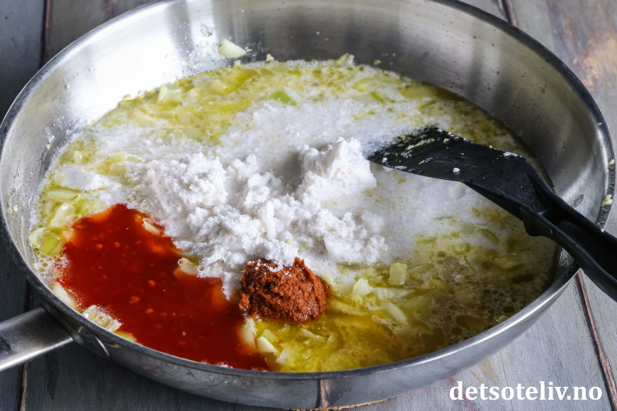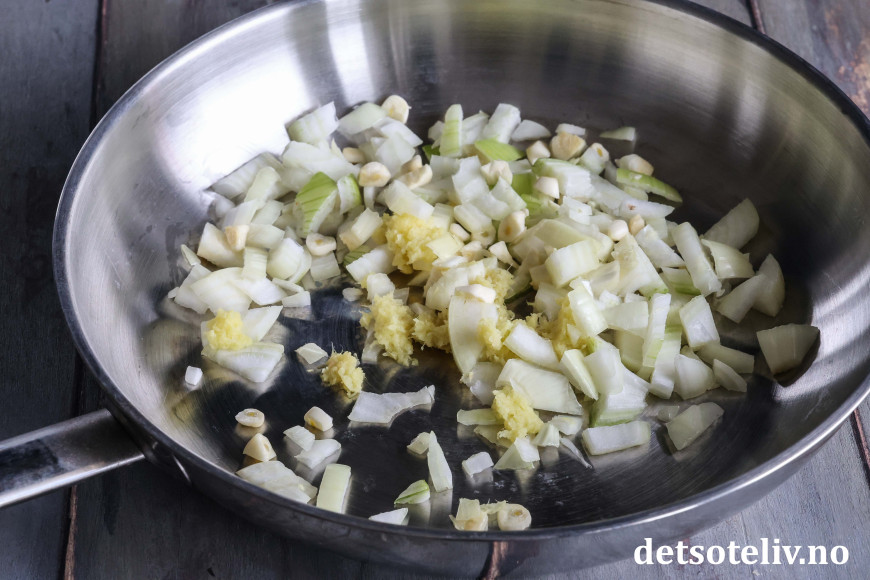 Bruk en stor stekepanne med litt høye kanter. Ha olje i pannen og tilsett kuttet løk, hvitløk og ferskrevet ingefærmos. La dette steke på middels varme i et par minutter til løken er gyllen og myk.