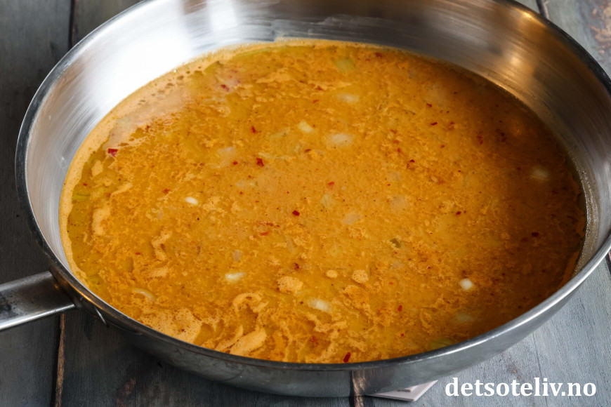 Tilsett kokosmelk, red curry paste (tilpass mendgen, se tips) og sweet chilisaus.