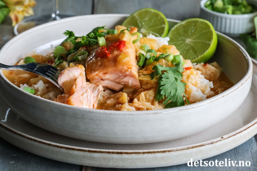 Serveres med kokt jasminris. Topp med lime, chili, vårløk og koriander.
