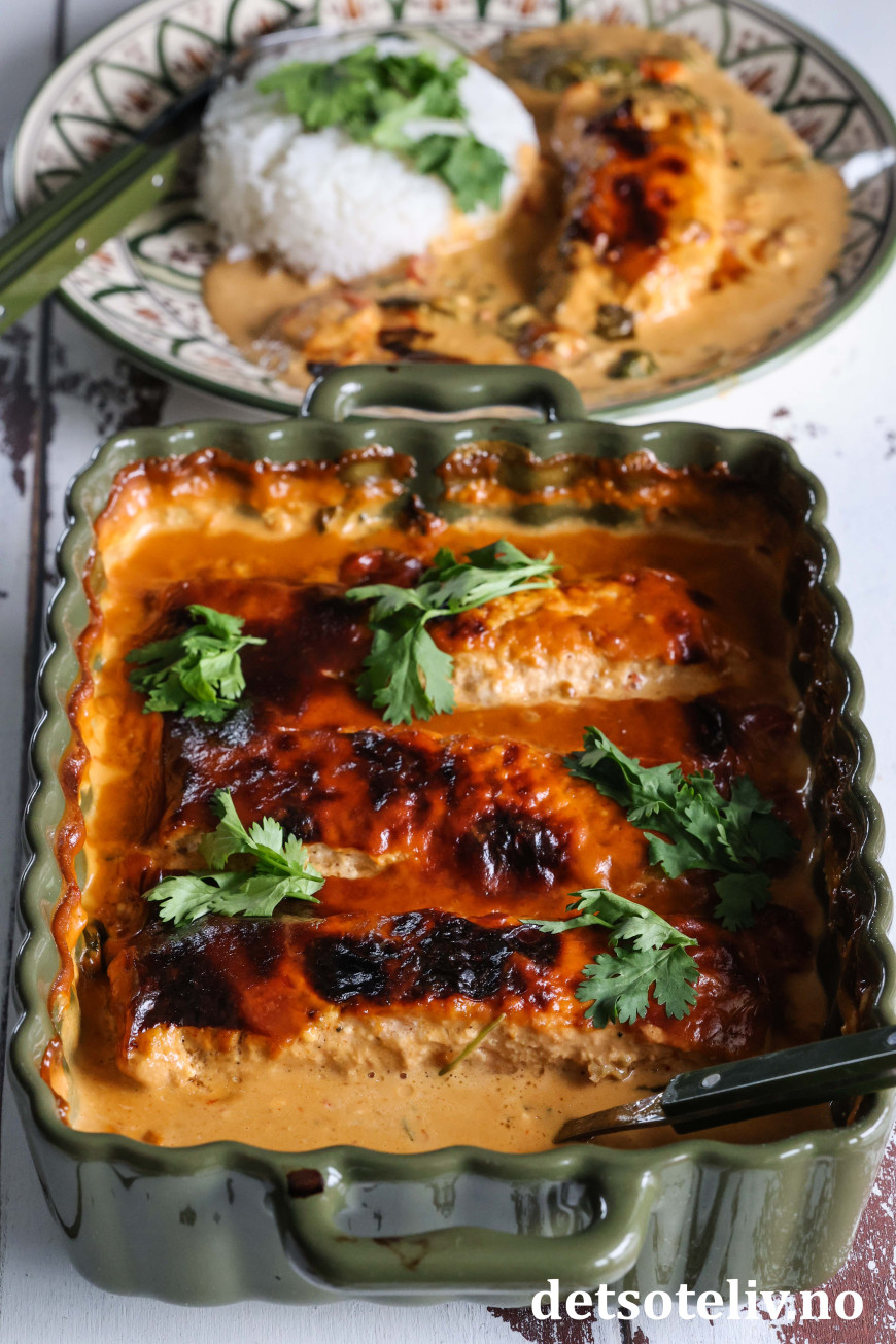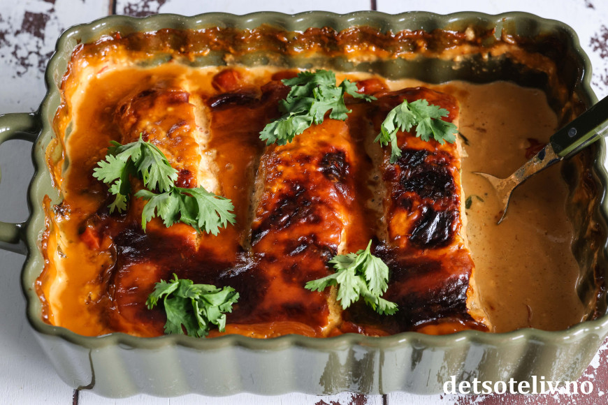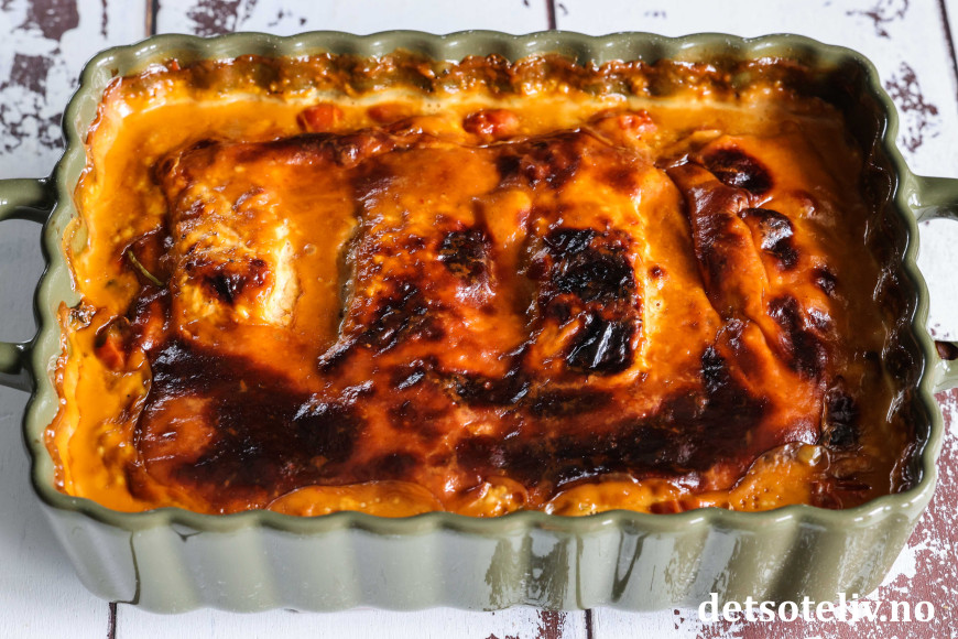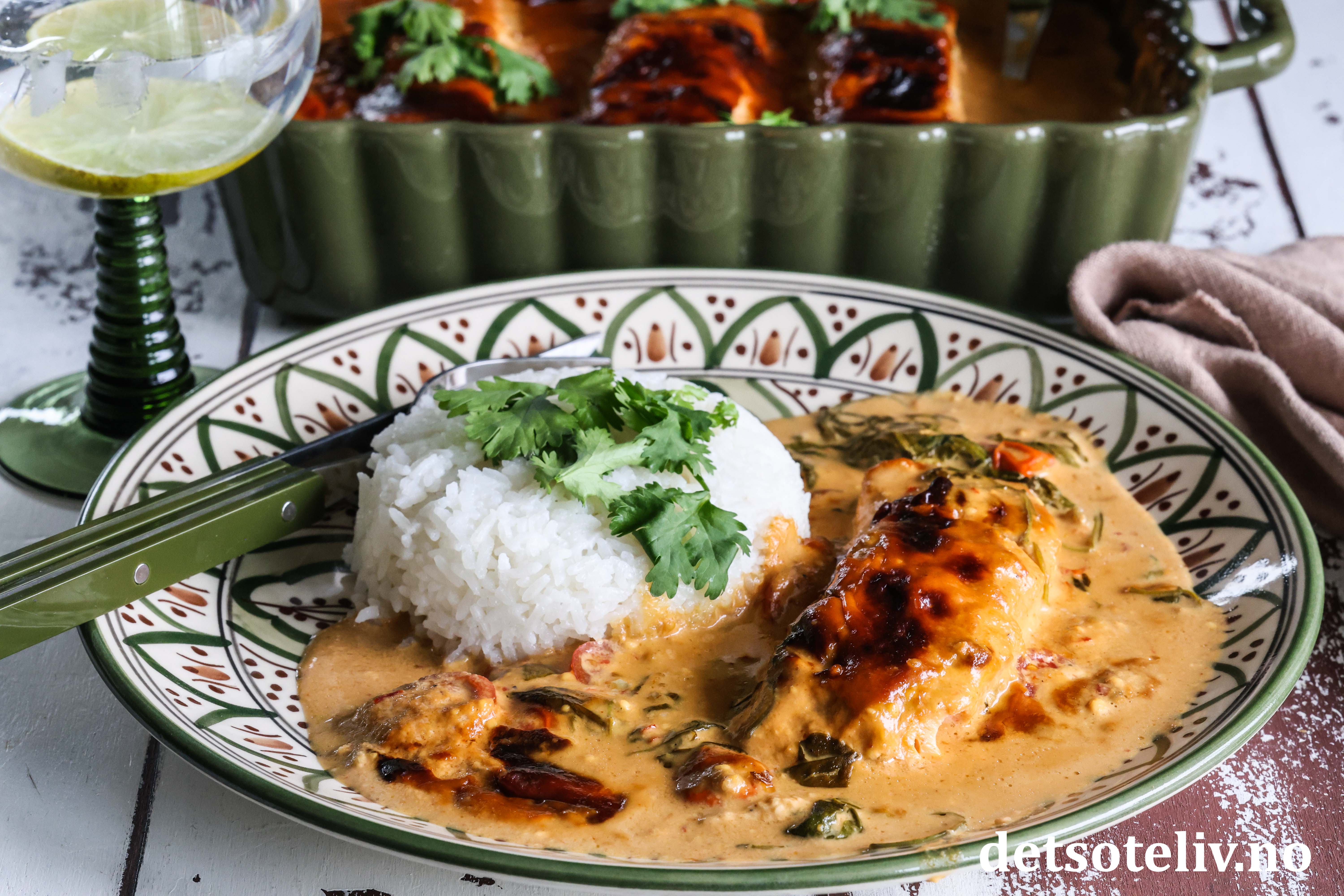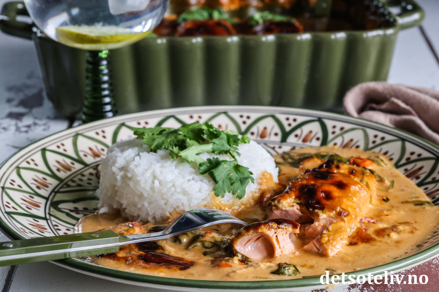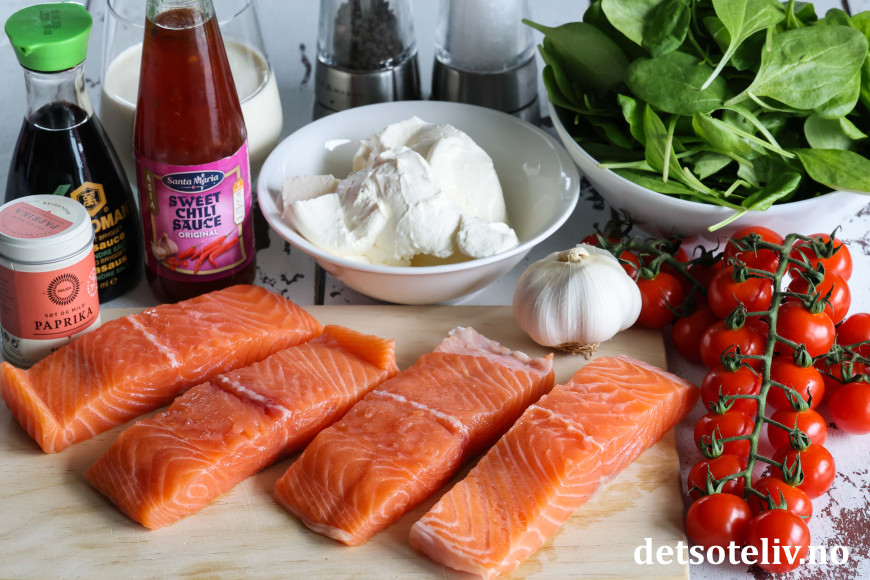I denne varianten legges laksefilet i en ildfast form sammen med spinat og cherrytomater. Så har man over en deilig saus laget av crème fraîche, fløte, hvitløk, soyasaus, paprikapulver og selvfølgelig sweet chilisaus. Sausen skal bare røres raskt sammen og helles over laksefiletene i formen.