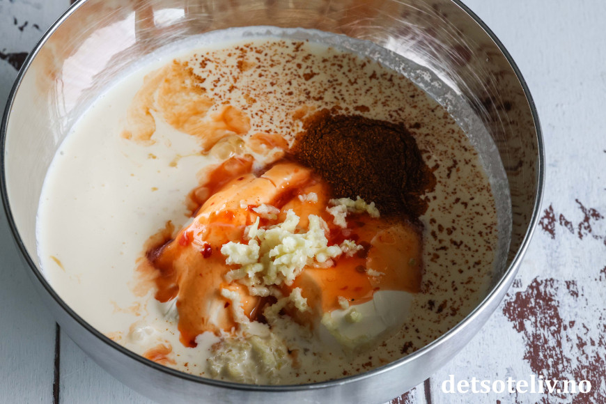 Ha crème fraîche, fløte, sweet chilisaus, pressede hvitløksfedd, soyasaus og paprikapulver i en bolle.